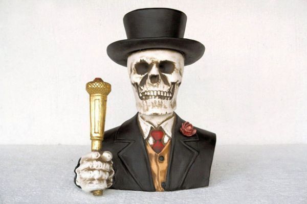 Schädel mit Anzug und Hut lebensgroß 52cm für draußen aus Polyresin