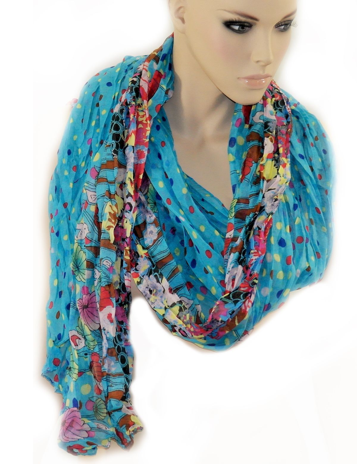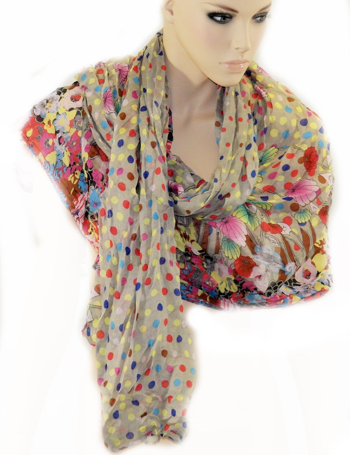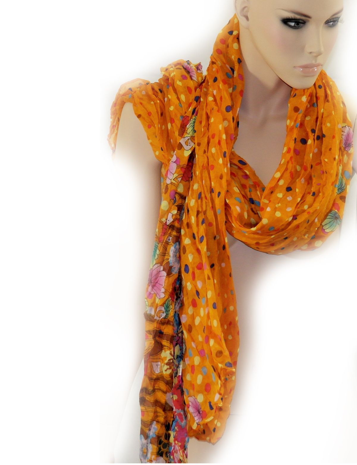 Schal Tuch •Modell: Schal Tuch •Größe: ca. 1,8 m •Farben: Orange, Türkis, Grün, Gelb, Pink, Beige, Grau, Weiss •Material: 100% Viskose Punkte- und Blumenmuster.