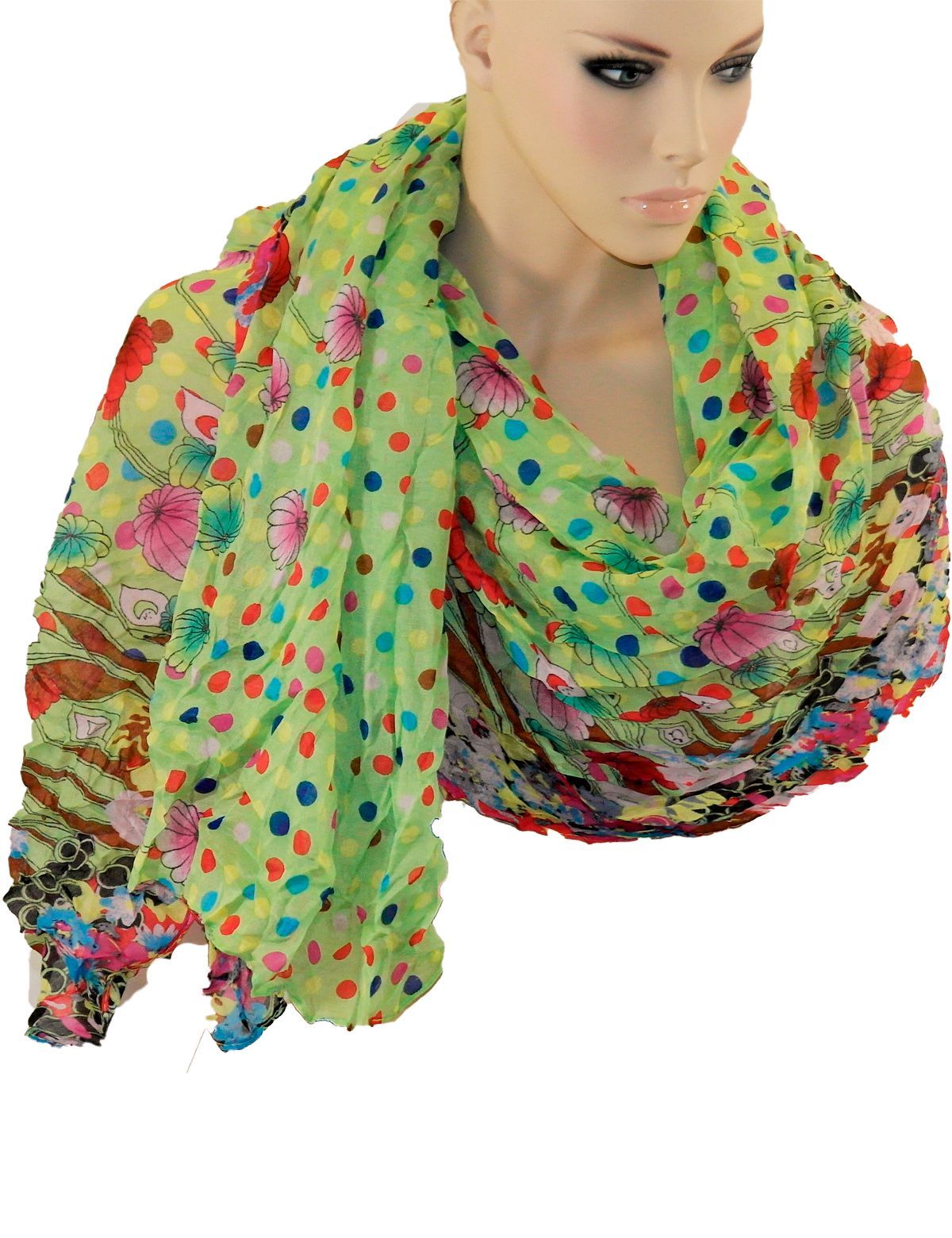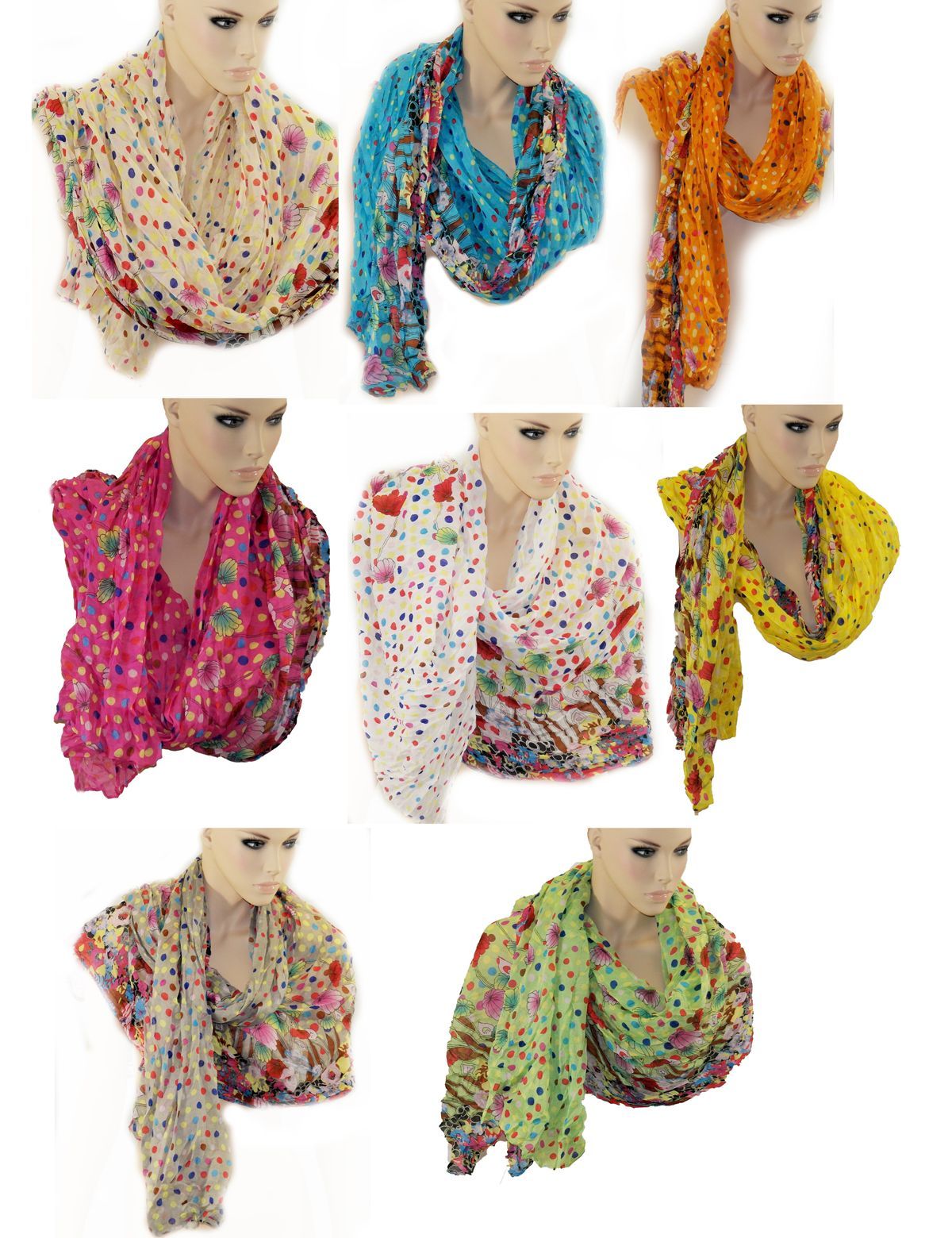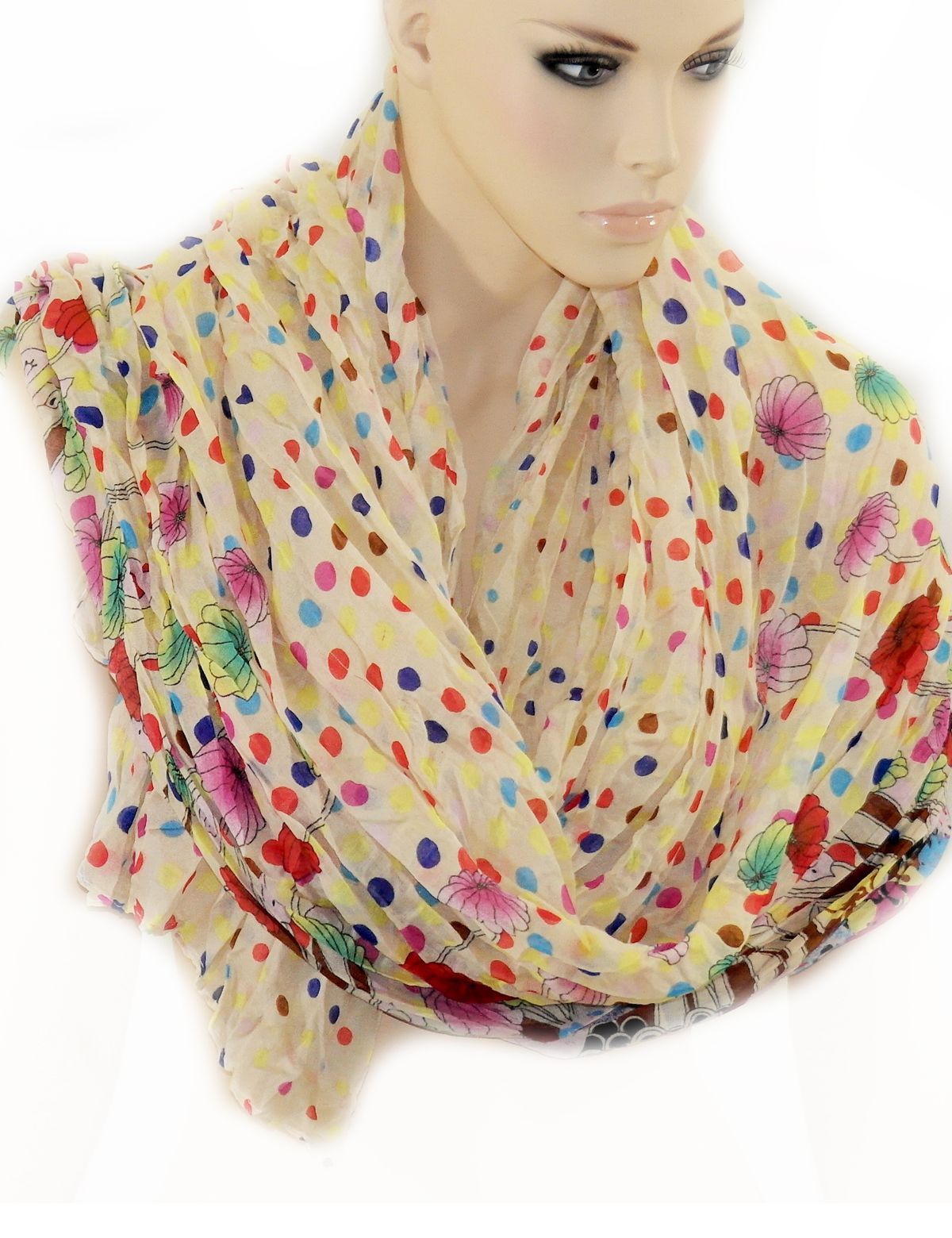 Schal Tuch •Modell: Schal Tuch •Größe: ca. 1,8 m •Farben: Orange, Türkis, Grün, Gelb, Pink, Beige, Grau, Weiss •Material: 100% Viskose Punkte- und Blumenmuster.