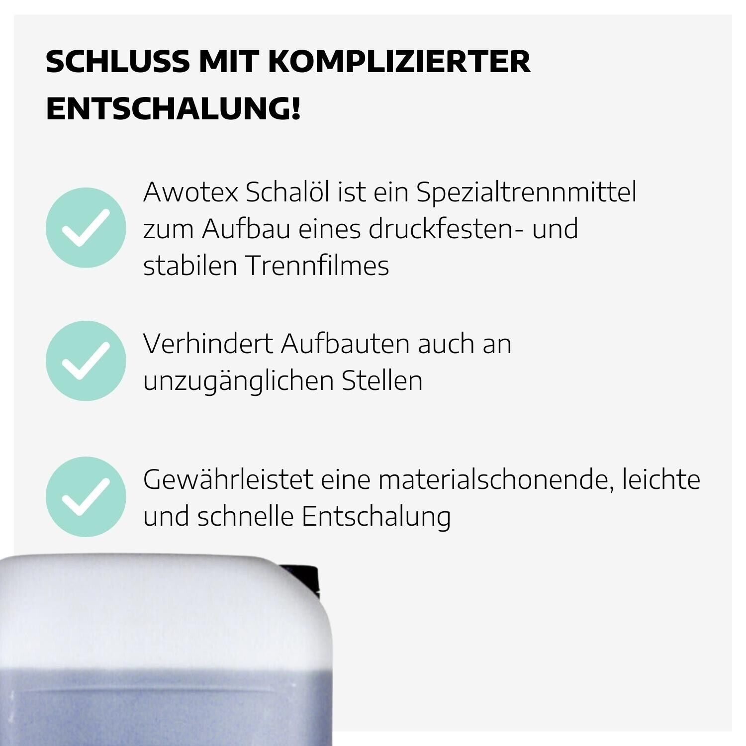 Erleichtern Sie die Arbeit auf Ihrer Baustelle mit dem Schalöl von Awotex. Dieses Trennmittel ist perfekt geeignet für Beton- und Schalungsarbeiten und wird in Deutschland hergestellt. Der Kanister enthält 30 Liter Schalöl und ist somit eine praktische und effiziente Lösung für den Produktions- und