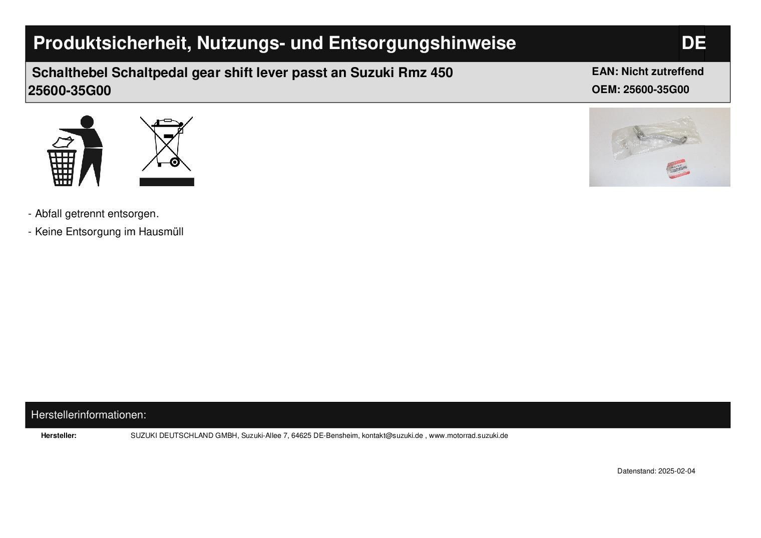 Schalthebel Schaltpedal gear shift lever passt an Suzuki Rmz 450 25600-35G00 In dieser Auktion gibt es folgenden Artikel zu kaufen: Schaltpedal (siehe Foto) Modell: passend für Suzuki RMZ 450 Bj.: 2005 - 2007 Lieferumfang: siehe Foto Artikelzustand: neu aus Geschäftsauflösung, mit minimalen Lagerspu