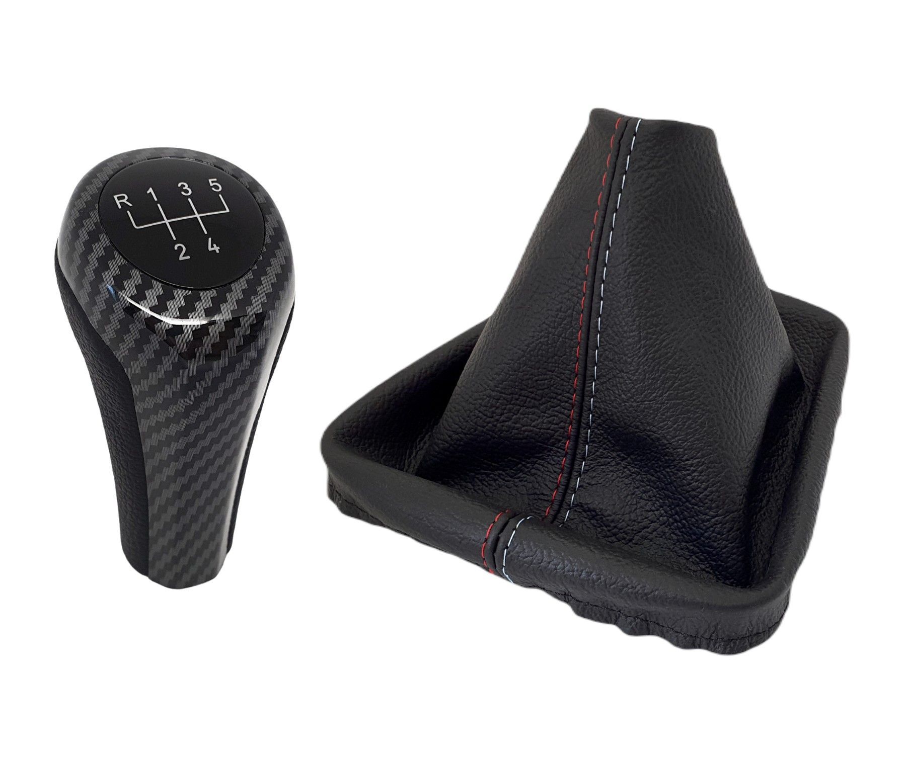 Schalthebel Carbon-Optik 5-Gang + Schaltmanschette Echtleder mit farbigen Nähten ohne Rahmen für BMW 3er 5er Info Schaltknauf: - Material: Kunstleder, Kunststoff - ca. 135g - Länge: 90mm Info Schaltsack: - Material: Echtleder Schwarz - Nahtfarbe: Rot, Hellblau Passend für folgende Fahrzeuge: - BMW 3