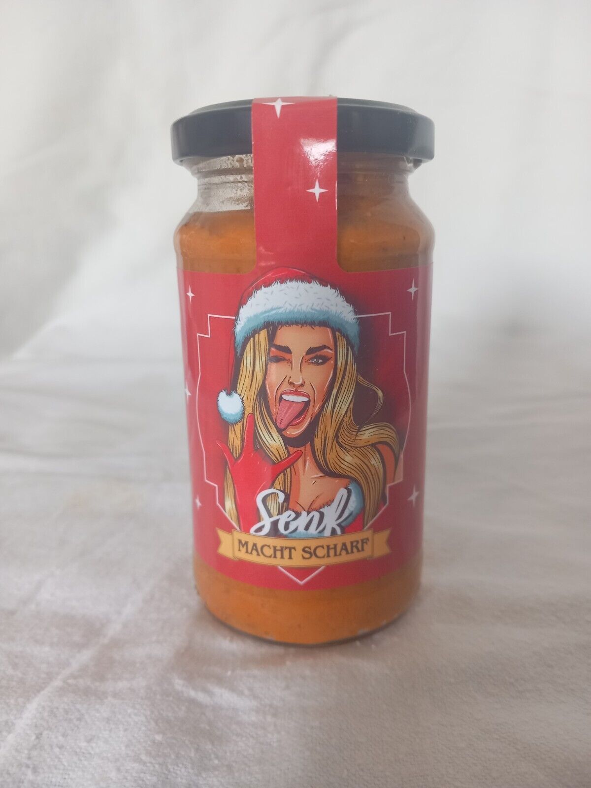 Scharfer Weihnachtssenf - Scharfer Lady Senf - 200 ml Glas Weihnachten steht wieder ganz überraschend vor der Tür. Der scharfe Chili – Weihnachts – Lady - Senf passt perfekt zu: Fleisch, Saucen, Dips und Fondue. Das wird bestimmt Dein schärfstes Weihnachtsfest. Er eignet sich aber auch a