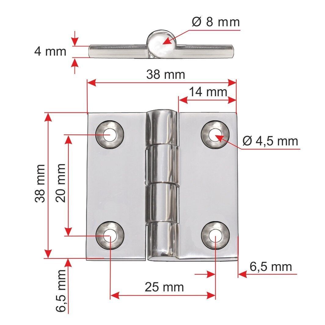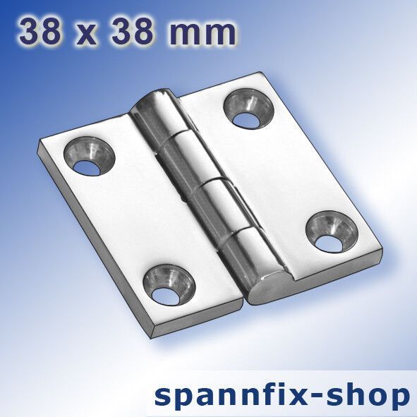 Scharnier 38 x 38 mm Door Hinge, stainless steel AISI 316 Artikel-Nr.: 8105.40.038.38 Ausführung: Feinguss massiv glänzend poliert Material: V4A Edelstahl stainless steel AISI 316 Größe: 38 x 38 mm Länge: 38 mm Breite: 38 mm Stärke: 4 mm Bohrung: 4x Durchschitt 4,5 mm Gewicht: 58 g Wählen Sie aus un