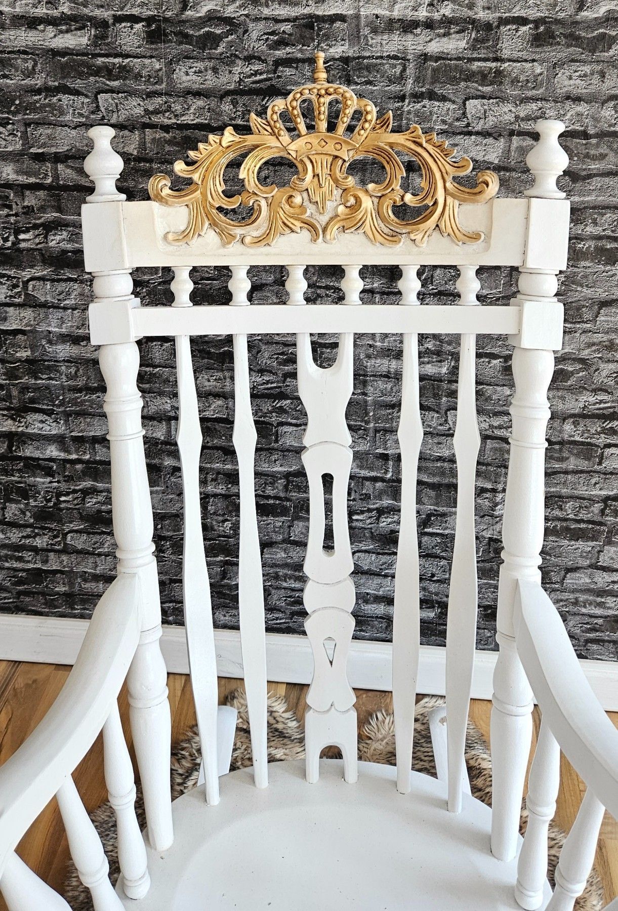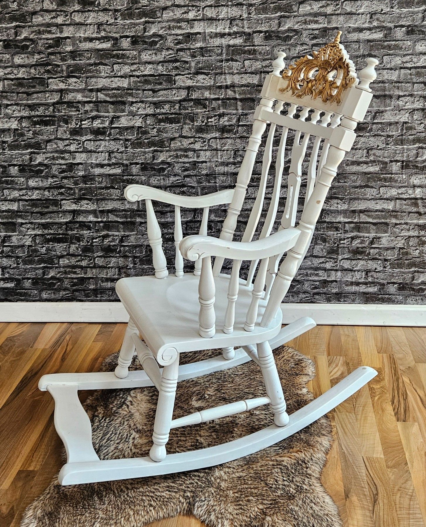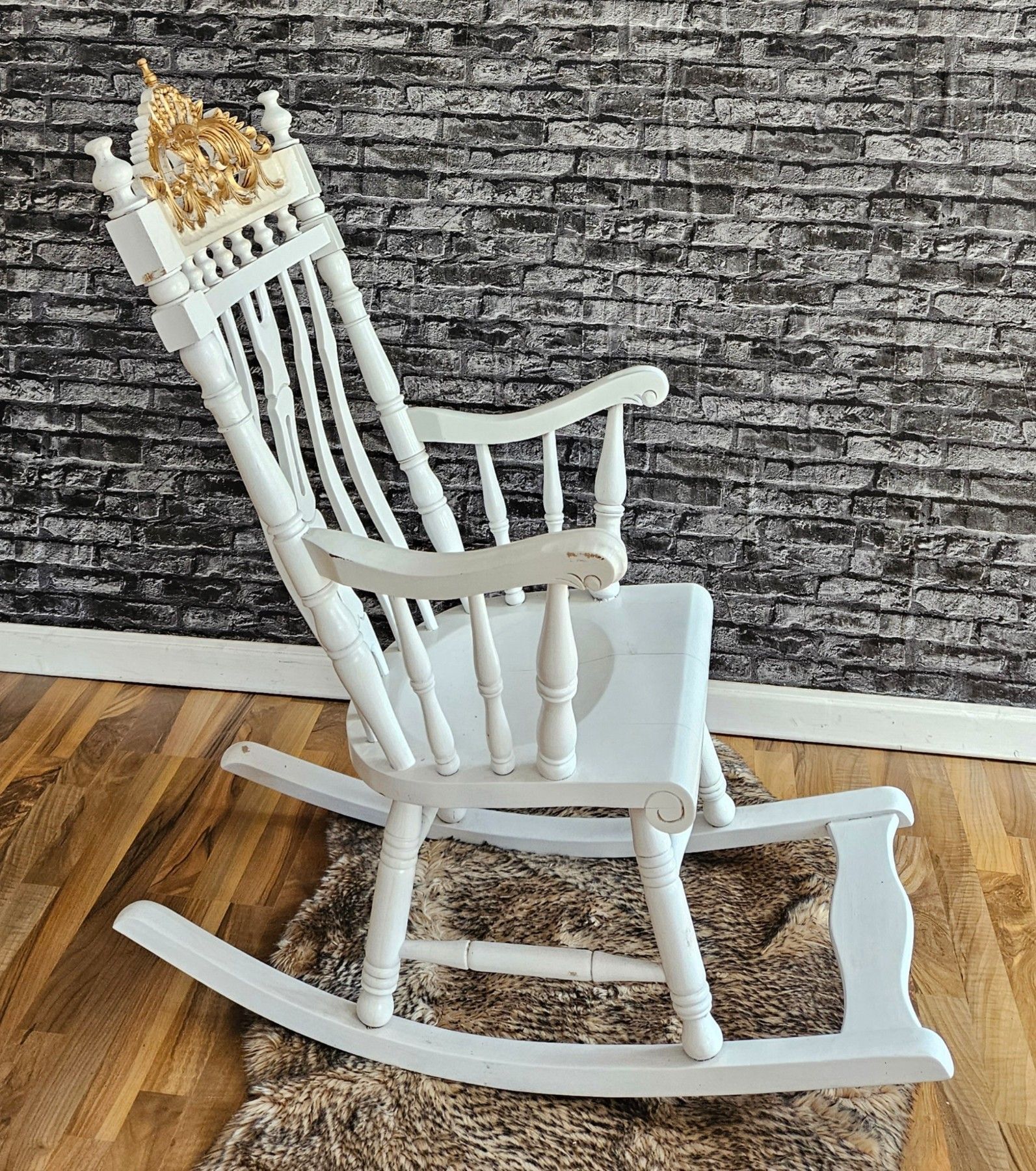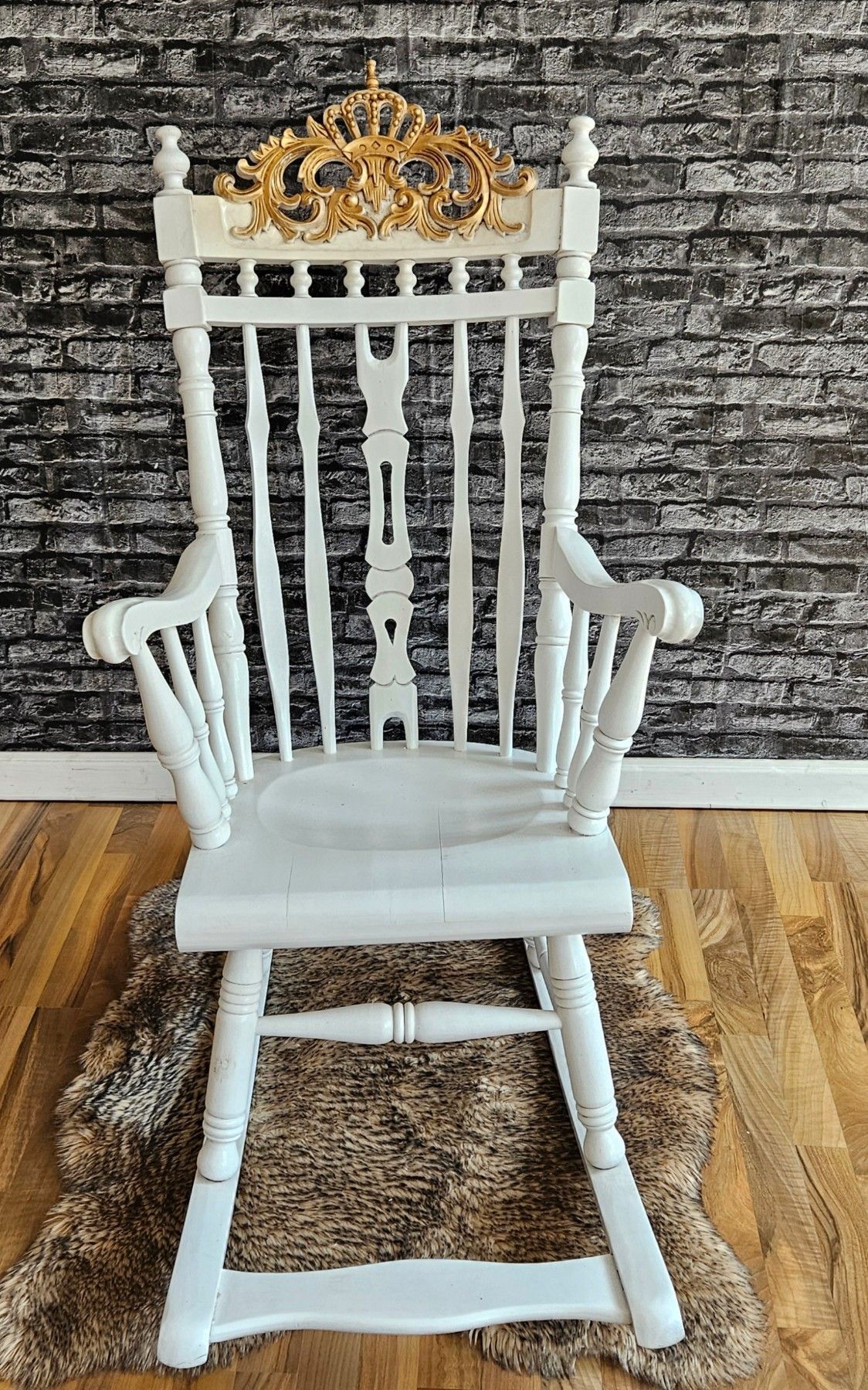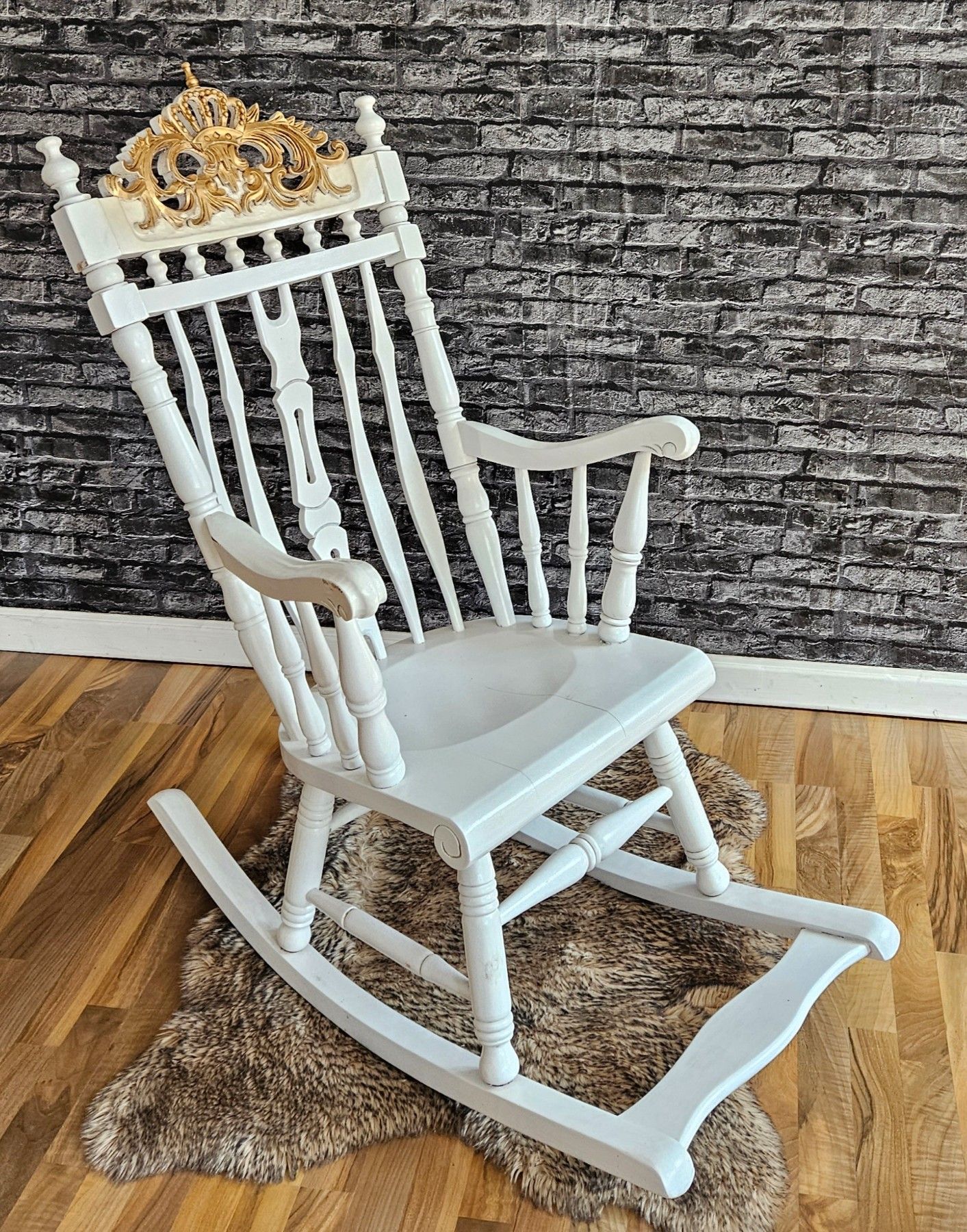 Schaukelstuhl Holz Schwingsessel Relaxstuhl weiß Gold Krone