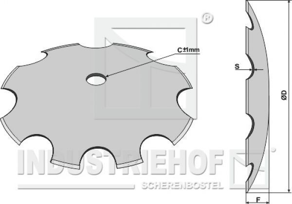 Scheibe für Scheibeneggen gezahnte Schneide Ø610x6mm Gewölbte Scheibe mit gezahnter Schneide für Scheibeneggen Zur Montage auf runder Welle Technische Daten: - Best.-Nr.: 31-361051 - Gewicht: 13.000 kg - Durchmesser: Ø 610 mm - Stärke: 6 mm - F: 94 mm - Bohrung: C Ø 52 mm &plusm