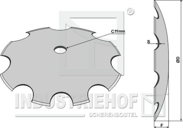 Scheibe für Scheibeneggen gezahnte Schneide Ø660x6mm Gewölbte Scheibe mit gezahnter Schneide für Scheibeneggen Zur Montage auf runder Welle Technische Daten: - Best.-Nr.: 31-366051 - Gewicht: 15.800 kg - Durchmesser: Ø 660 mm - Stärke: 6 mm - F: 103 mm - Bohrung: C Ø 52 mm &plus