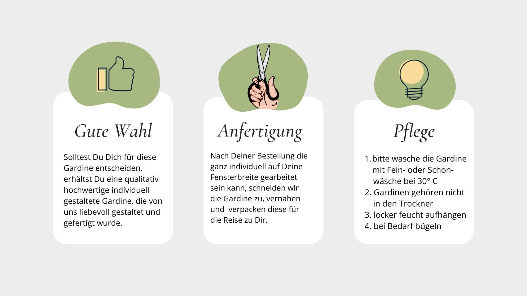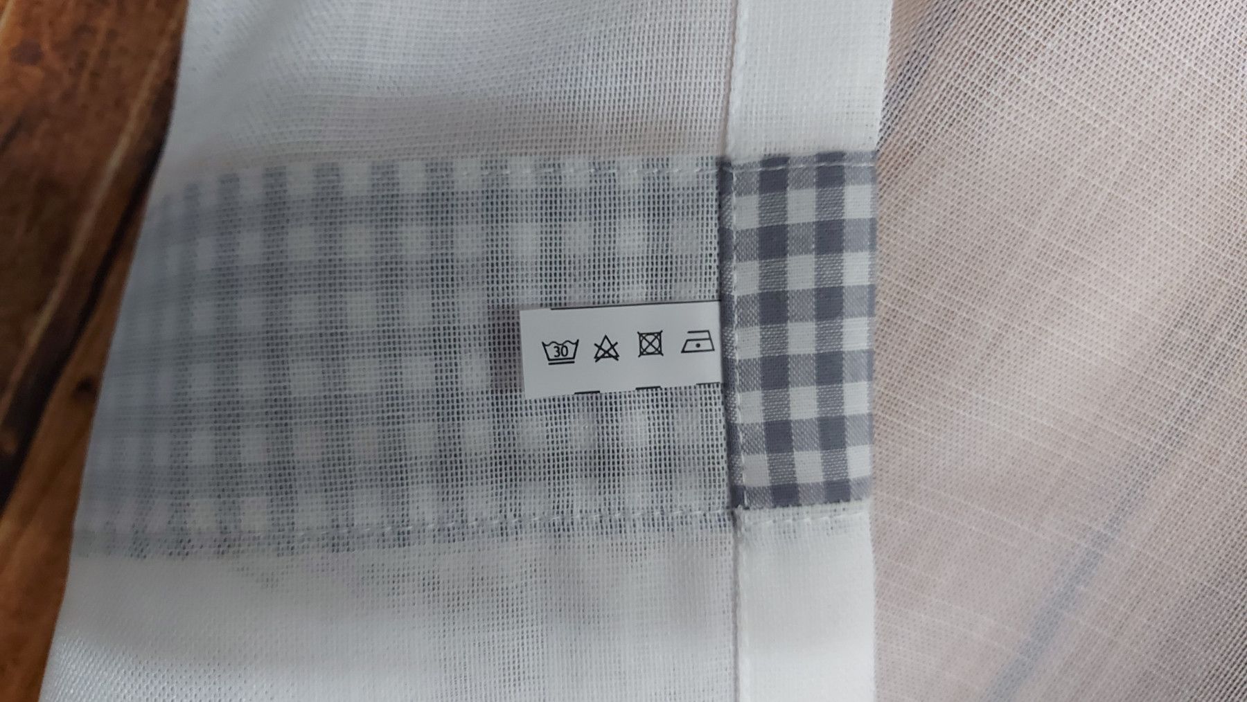 Dieser Fensterbehang ist hochwertig gearbeitet. Das Grundmaterial besteht aus einem leicht ecrúfarbenem Polyestergewebe, das gut durchlässig ist. Die Schlaufen und der dekorative Besatzstreifen sind aus reinem Baumwollstoff und verleihen der Scheibengardine einen modernen, aber auch einen gewissen Landhaus-Charme.