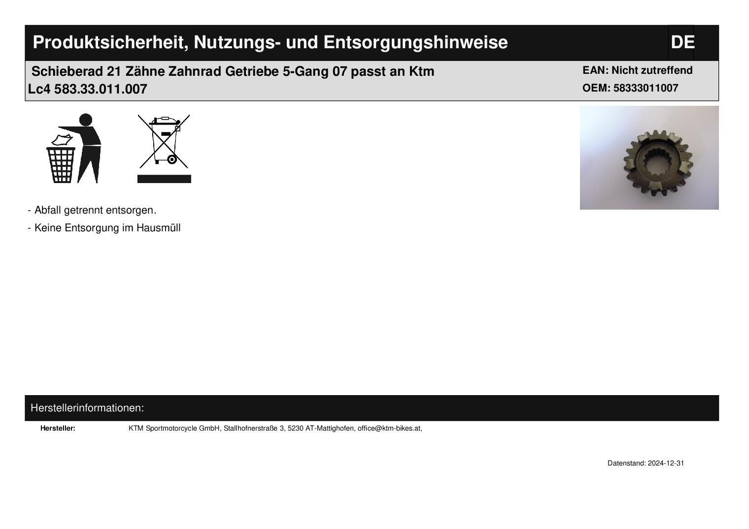 Schieberad 21 Zähne Zahnrad Getriebe 5-Gang 07 passt an Ktm Lc4 583.33.011.007