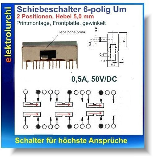 Sie bieten hier auf folgenden Artikel 1 Stück Schiebeschalter 6-polig 2-Pos. gewinkelt Print Hebel Metall 5mm Hochwertiger Schiebeschalter für kleine Signale Technische Daten: Kontakte: 6-polige Umschaltkontakte Belastbarkeit: 0,5Amp. 50VDC Hebelhöhe: 5mm Länge: 32,0mm Breite: 9,2mm Höhe : 12mm Durc
