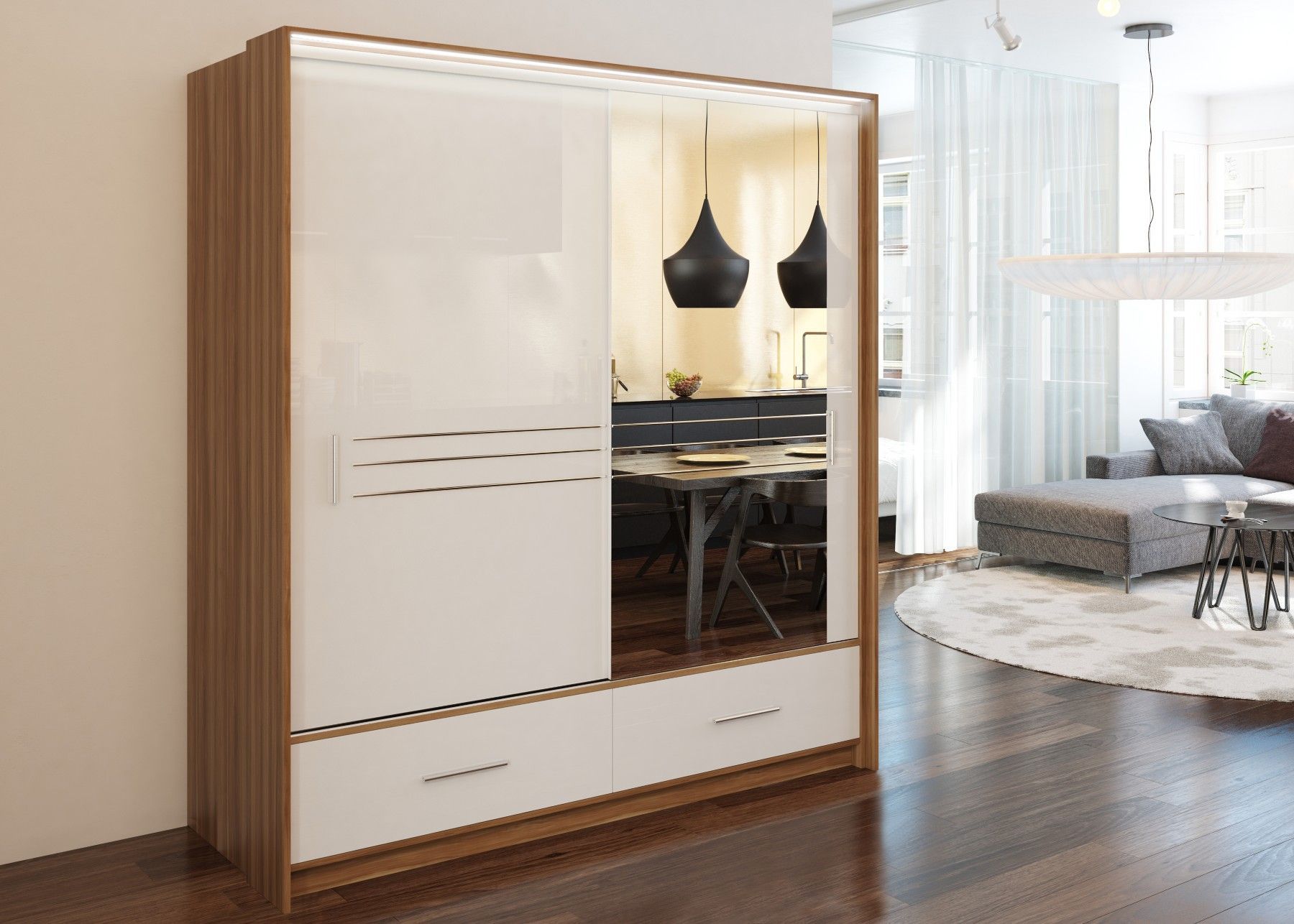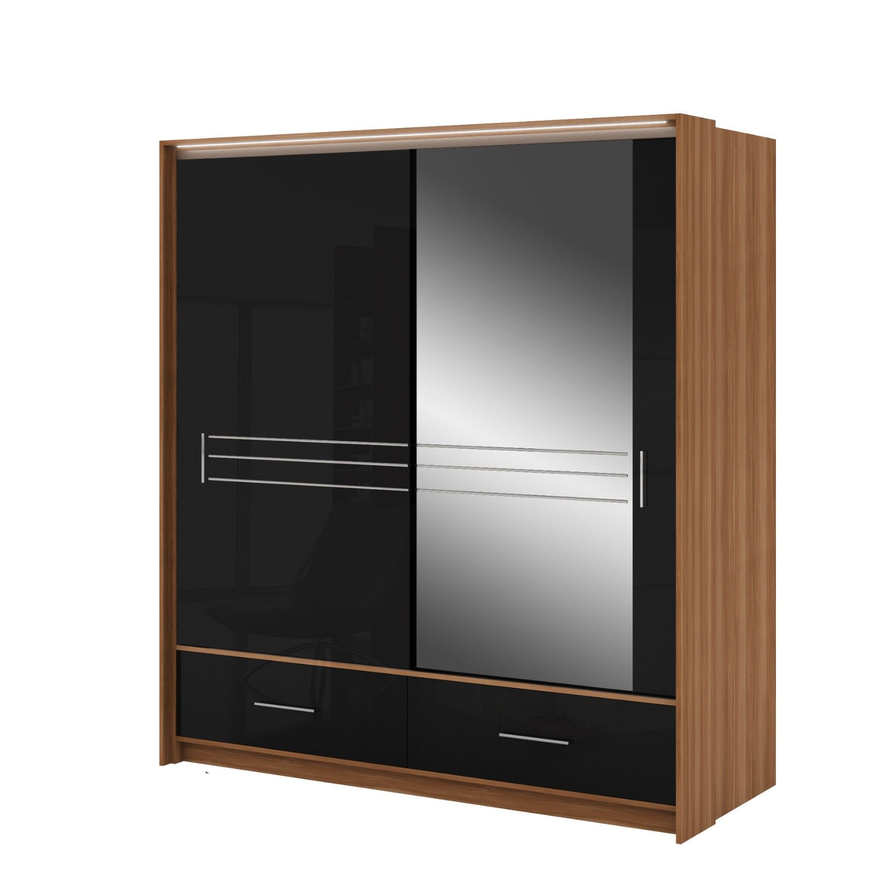 Kleiderschrank : AMSTERDAM 203 Der Kleiderschrank AMSTERDAM 203 ist eine Neuheit in unserer Firma. Der Kleiderschrank hat zwei Schiebetüren, die bequeme Griffe und zwei Schubladen. Der Kleiderschrank hat zwei Kleiderstangen und die Einlegeboden. Fronten aus Hochglanz Funktionales Interieur, sichere