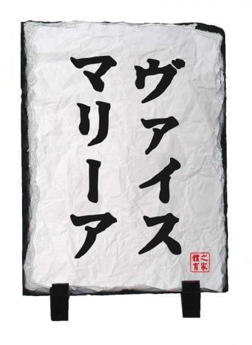 Ein Naturprodukt aus Schiefer bedruckt mit dem Namen in japanischen Schriftzeichen Kanji. - Natürliche Oberflächenstruktur mit welligen, abfallenden Rändern - Jedes Stück ist ein Unikat in Maserung, Form und Facettenschliff, da es ein Naturprodukt ist.