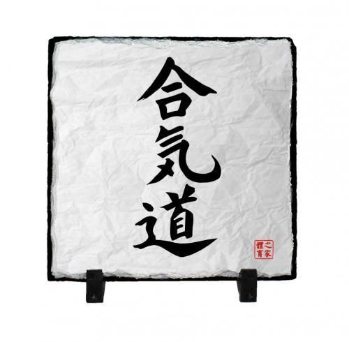 Ein Naturprodukt aus Schiefer bedruckt mit dem japanischen Schriftzeichen Aikido. - Natürliche Oberflächenstruktur mit welligen, abfallenden Rändern - Jedes Stück ist ein Unikat in Maserung, Form und Facettenschliff, da es ein Naturprodukt ist.