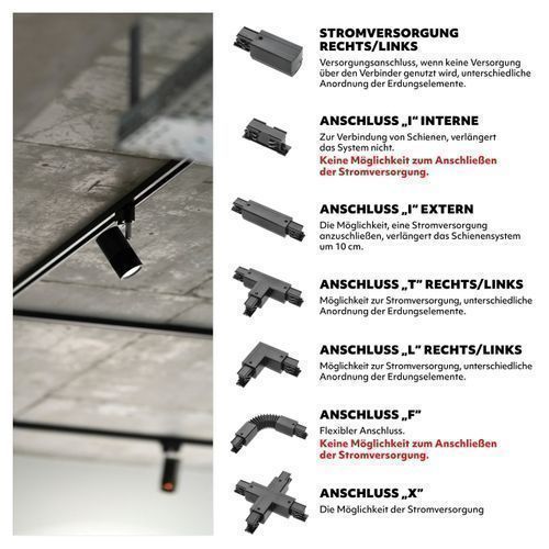 Schienensystem Komplett-Set Schiene 1m+2m, 5x Lampe, L-Steckverbinder rechts schwarz