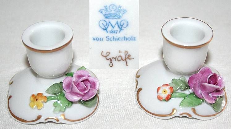 Schierholz Gräfe 2 kleine Porzellan Kerzenständer mit Rosen Dekor und Goldrand