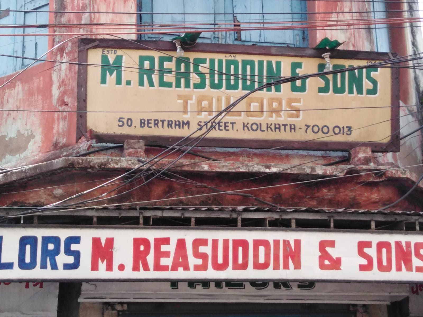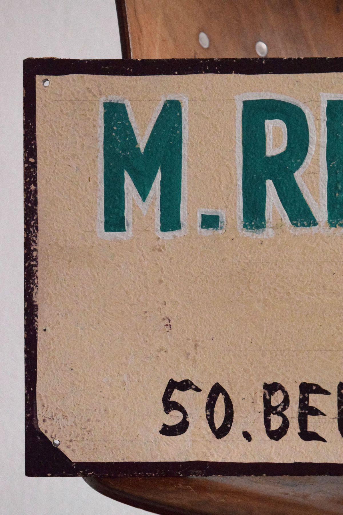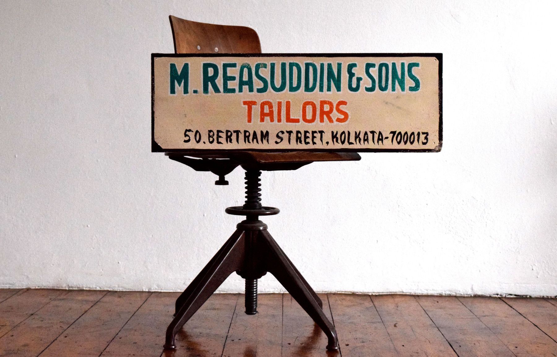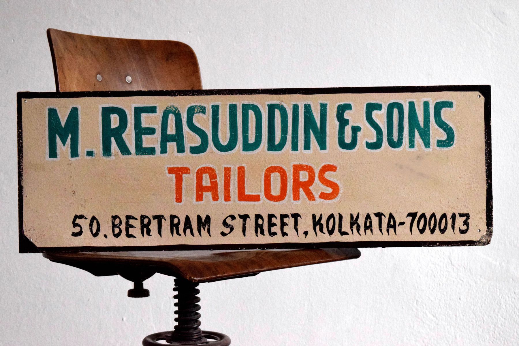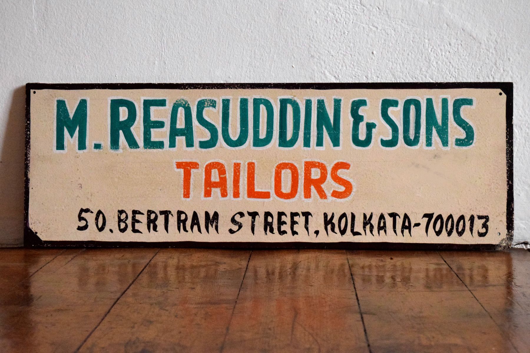 großes handgemaltes Schild "M. Reasuddin & Sons Tailor" (New Market Kolkata) Malerei, Acyl auf einer Verbundstoffplatte (2020, Indien, Kalkutta) Höhe 25cm, Breite 75cm, Tiefe 1cm inkl. Bohrungen zum Aufhängen Der Versand innerhalb Deutschlands ist kostenlos. Verkauf ohne Deko.