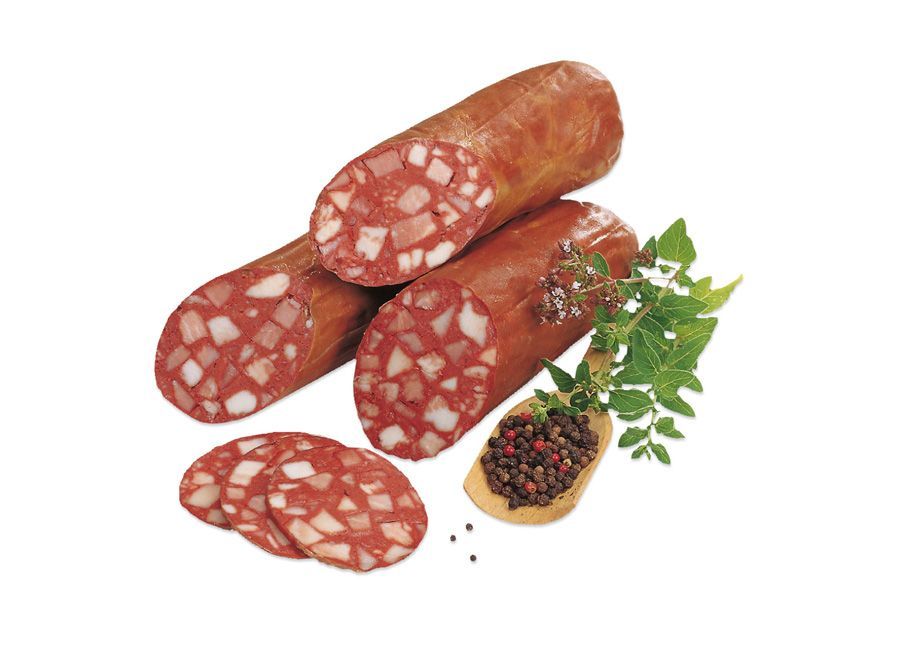 Unsere Schinkenrotwurst - ein kerniger Genuss! Zur Herstellung unserer Rotwurst verwenden wir mild gepökelte Schinkenwürfel, kernig gekochten Rückenspeck und eine Schwartenmasse als Basis. Im Kunstdarm, geräuchert über Tannenspänen ergibt sich ein vollendet würziger Geschmack. Probieren Sie unsere R