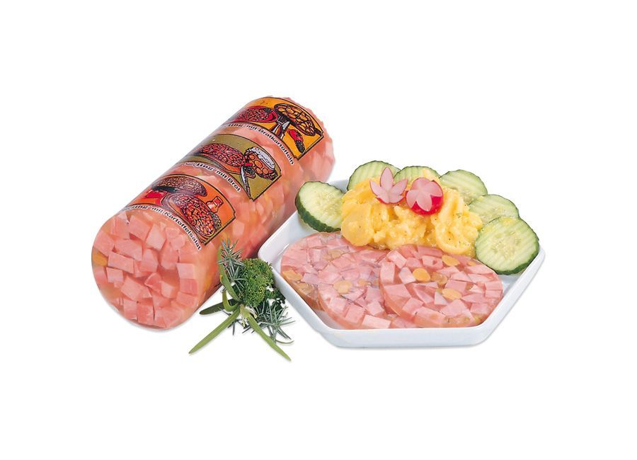 Unsere hochwertige Schinkensülze wird nach traditionellem Rezept hergestellt. Von Hand wird die Schinkensülzeinlage in akkurate Würfel geschnitten. Bestandteile unserer Schinkensülze: magere gekochte Schinkenstückchen, vermischt mit roten Paprikaschoten, hellen Minichampignons und süßsauren Gurkensc