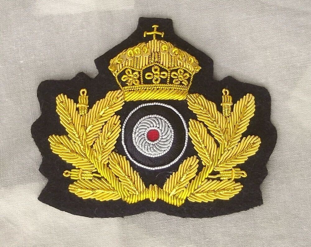Schirmmützen Abzeichen Marine Schirmmützenabzeichen für Offiziere der kaiserlichen Marine im 1. Weltkrieg. Handgestickte Ausführung, hochwertige Sammleranfertigung. Eichenblattkranz, Kokarde & Krone auf schwarzem Grund. Material: Baumwolle Metallfaden. Größe ca. 8,3 x 7 cm (B x H)