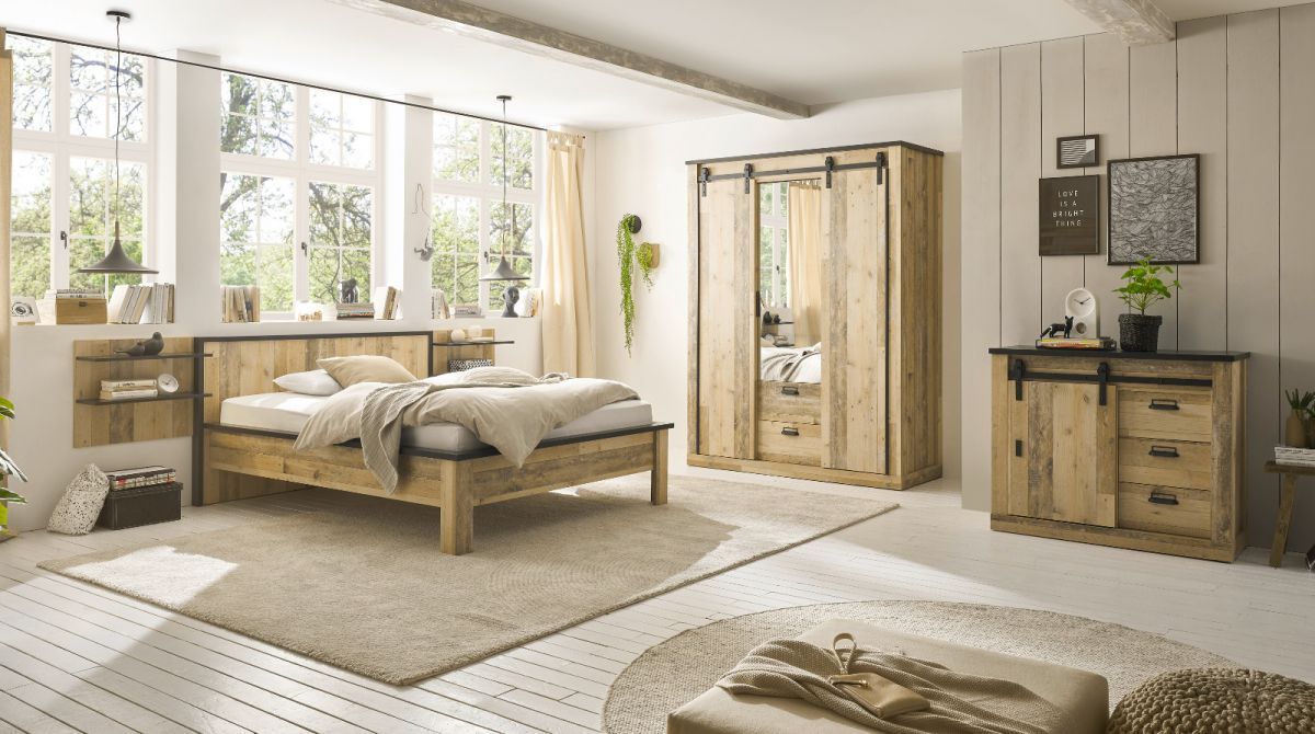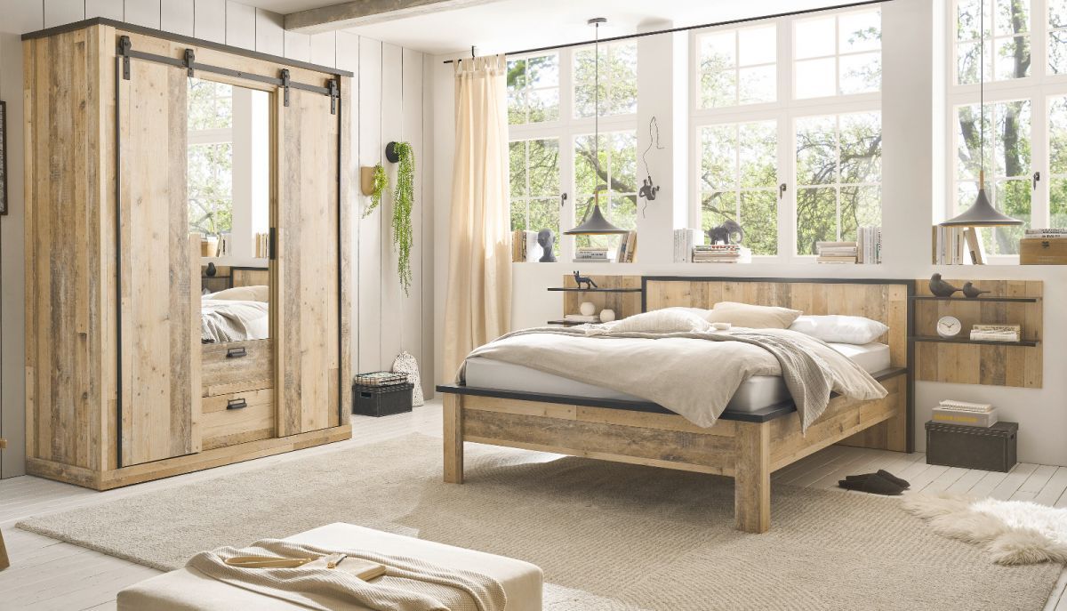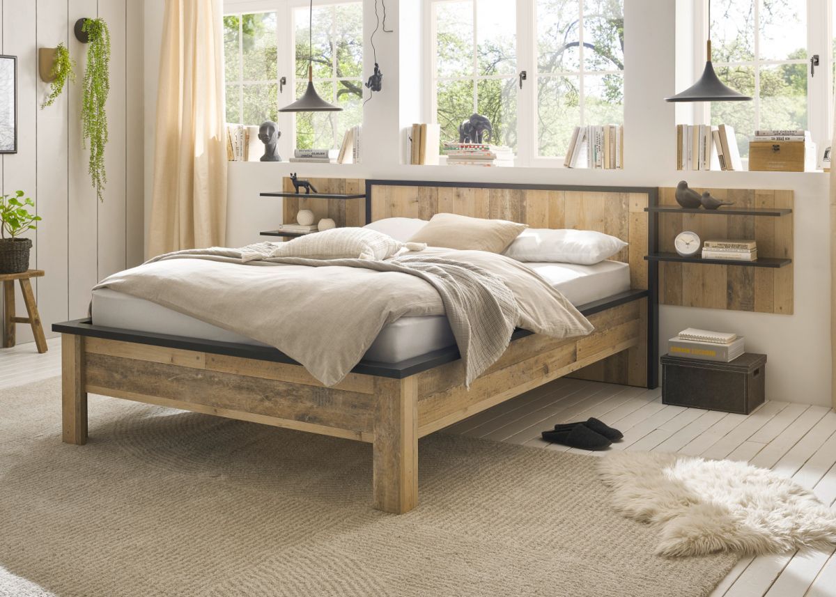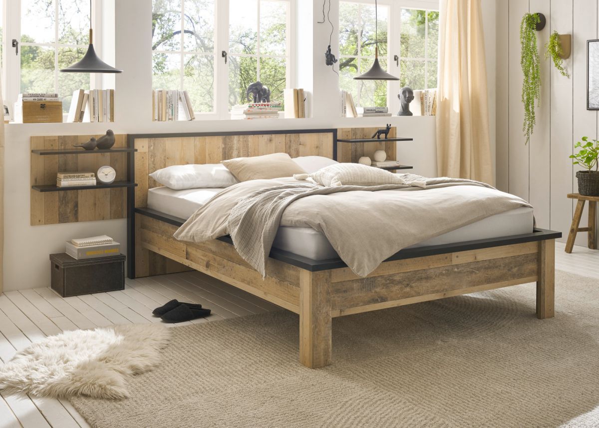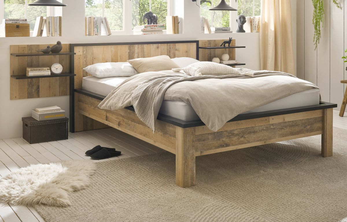 Schlafzimmer Set 3-tlg in Used Wood mit Bett 140 x 200 cm und 2 x Wandpaneel Stove