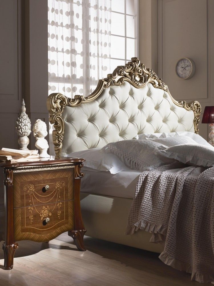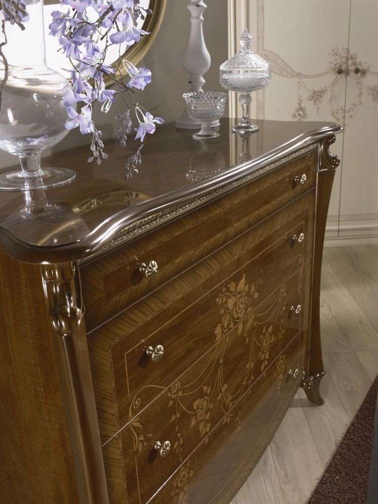 Schlafzimmer Set Compose in Barock Design 160x200 cm mit Kommode und Spiegel COM-SET-3 Elegantes Schlafzimmer Set Compose mit Melamin-Holzstruktur mit Siebdruck in Mattglanz und vielen weiteren Details Lieferumfang 1x Doppelbett mit Stauraum mit aufwändig gearbeiteten Kopf- und Fußteil in Mattglanz