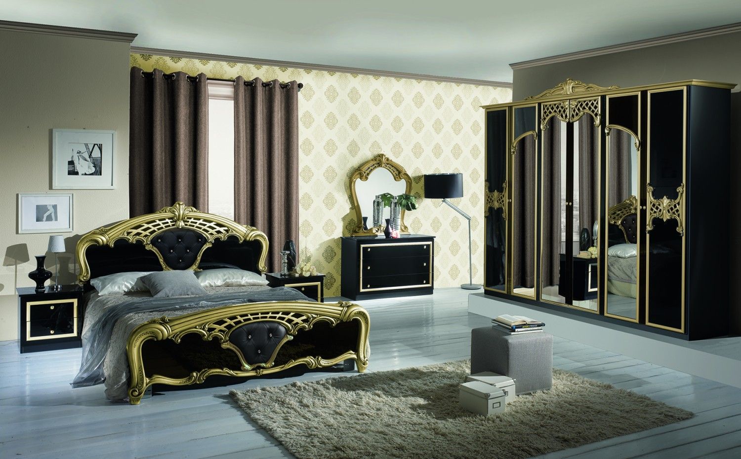 Schlafzimmer Set Elisa Weiss Gold 7 teilig 160x200 cm / mit Schrank 6 türig