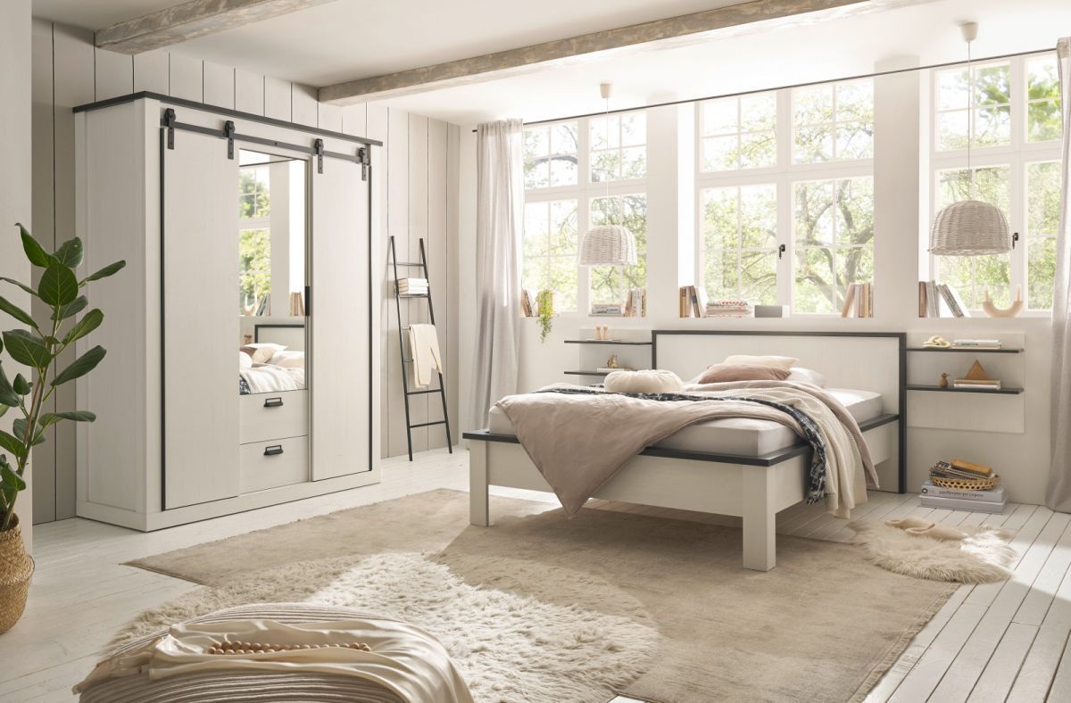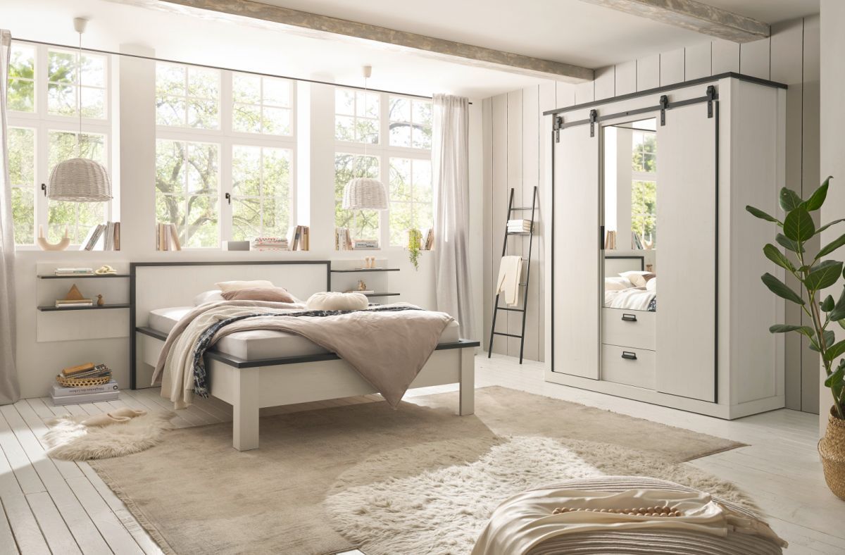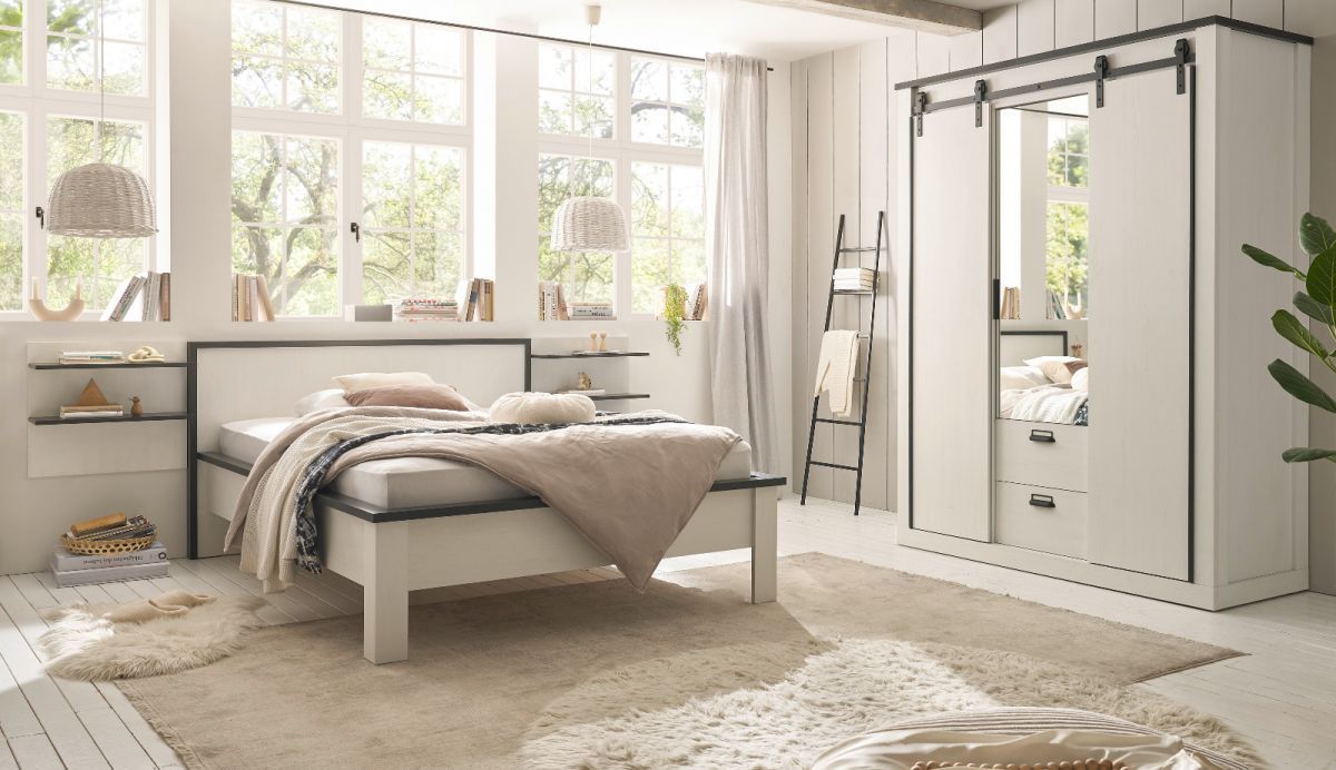 Schlafzimmer Set komplett weiß Landhaus mit Bett Kleiderschrank 2 x Wandpaneel Stove