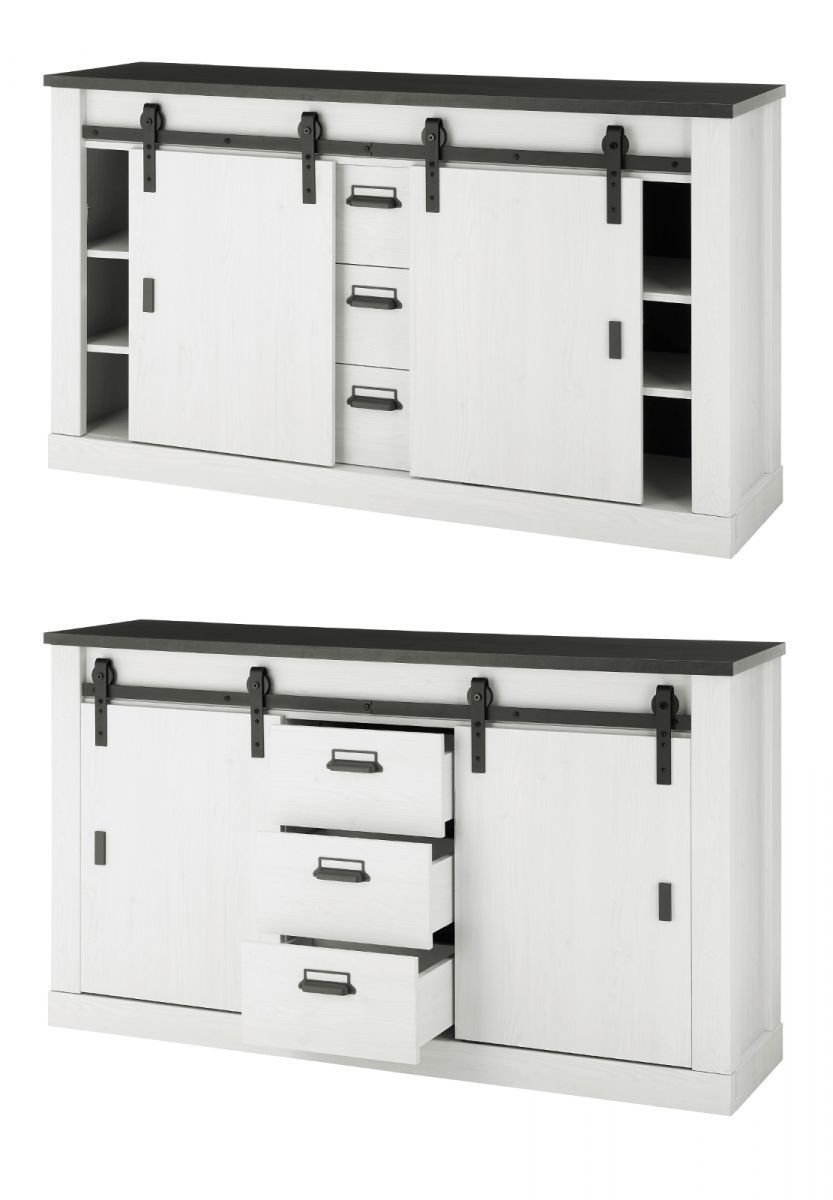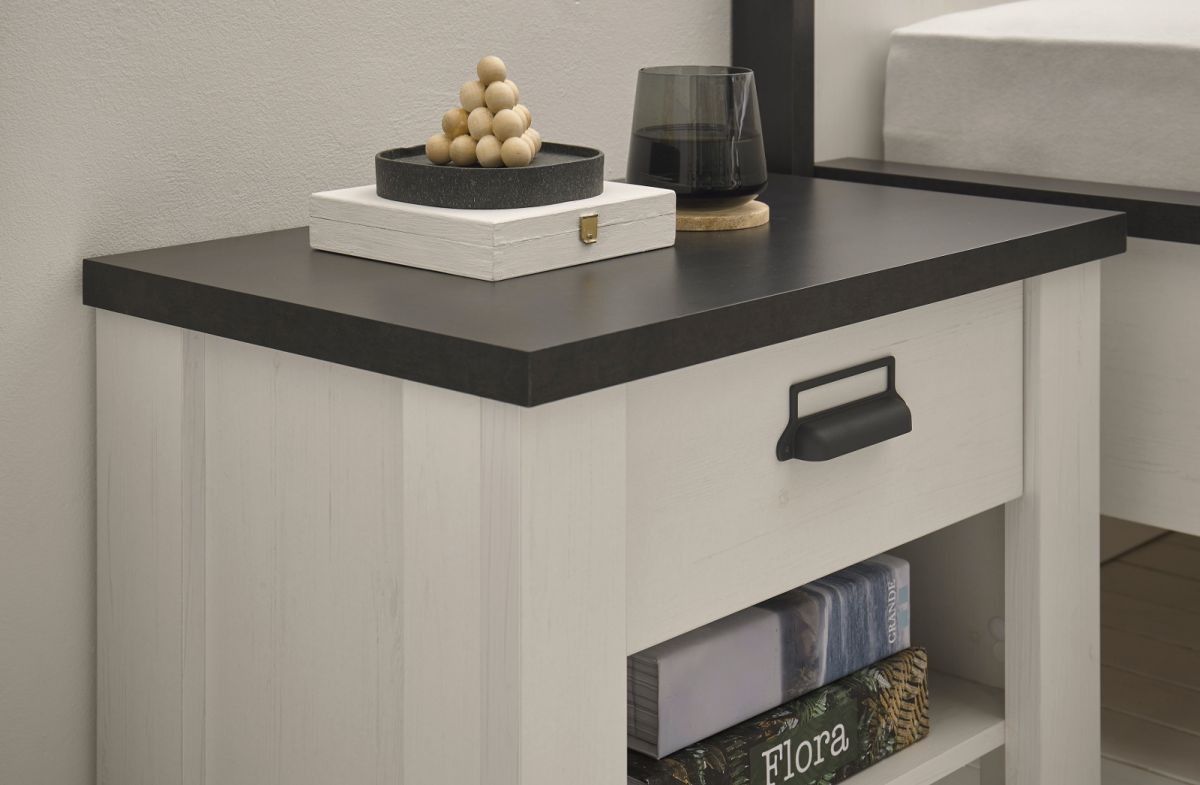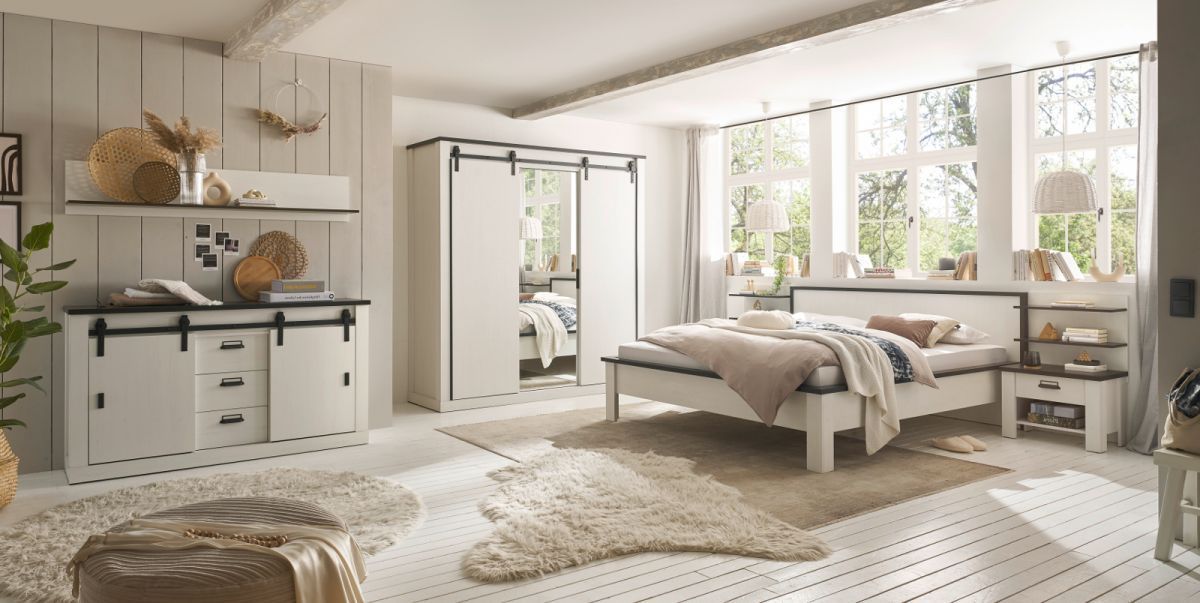 Schlafzimmer Set mit Bett Schrank Sideboard 2x Nachttisch Paneel weiß Landhaus Stove