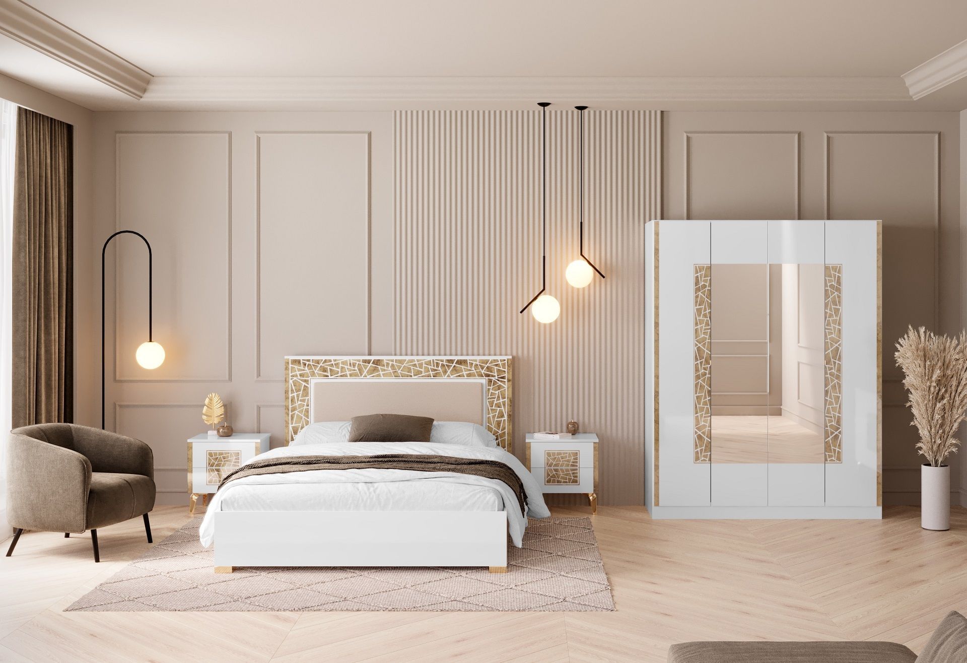 Schlafzimmer-Set Stella 4-Teilig in Weiß/Gold Hochglanz