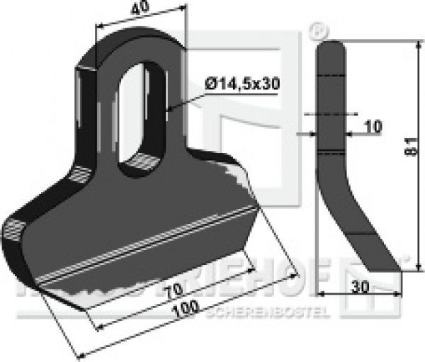 Schlegelmesser Mulchmesser 63-NOB-45 passend für Kuhn Mulcher Technische Datem: Best.-Nr. 63-NOB-45 Gewicht 0,333 kg Dicke 10 mm Bohrung 14.5 X 30 mm Breite-Aufnahme 40 mm Messerbreite-Mitte 100 mm Messerbreite - Unten 70 mm Tiefe 30 mm Artikel passend für Fabrikat: Kuhn Mulcher Obenstehende Origina