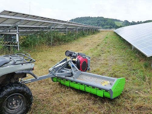 Spezialkonstruktion mit extrem seitlich angeordneter Antriebseinheit sehr flaches Mähwerk 1500 mm Arbeitsbreiten Schnitthöhe verstellbar von 0 bis 100 mm Deichsel 45° nach links oder rechts verstellbar 12.500 m²/h Flächenleistung