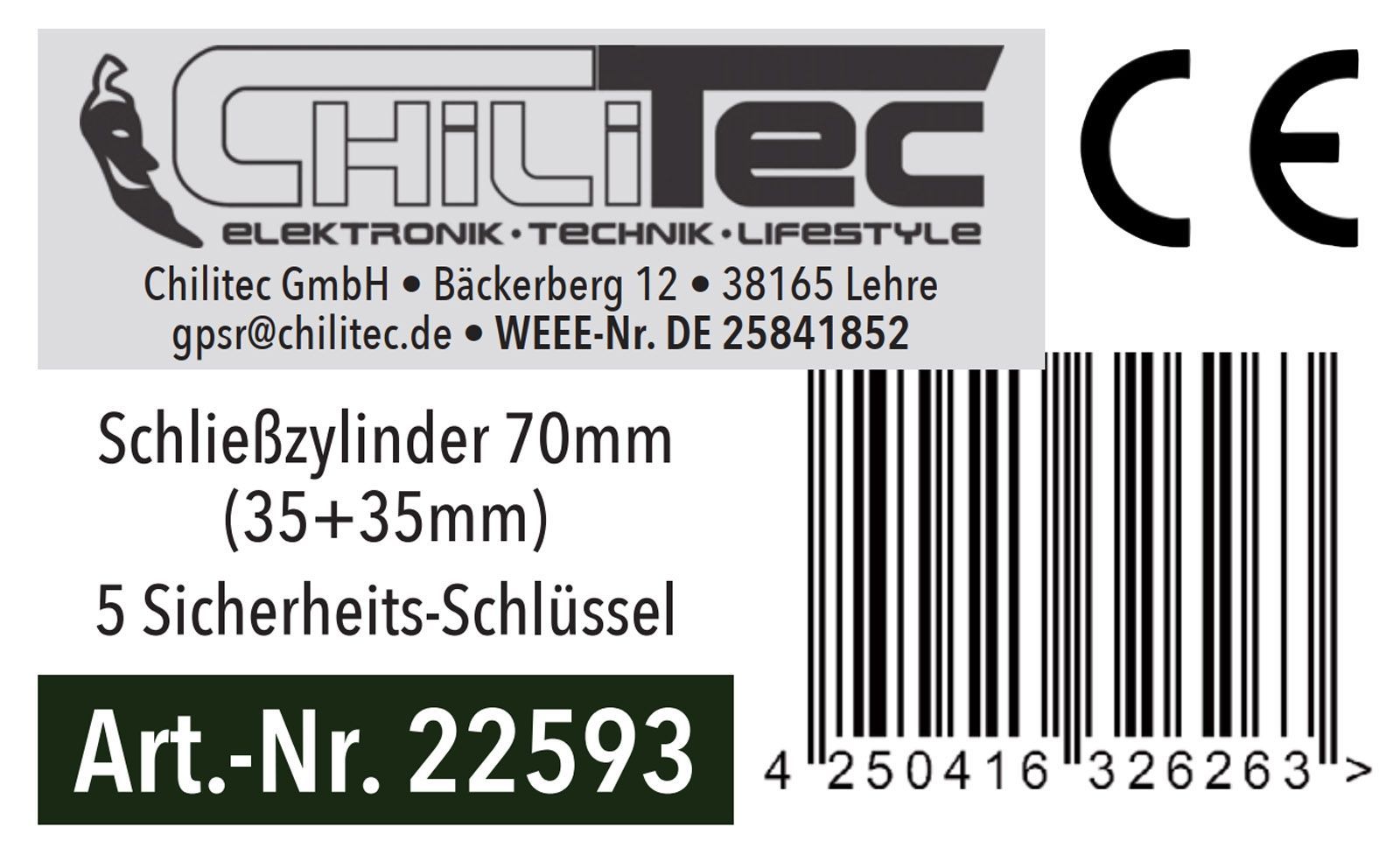 ChiliTec Schließzylinder 70mm (35 + 35mm)Profil-Zylinder, 5 Sicherheits-Schlüssel