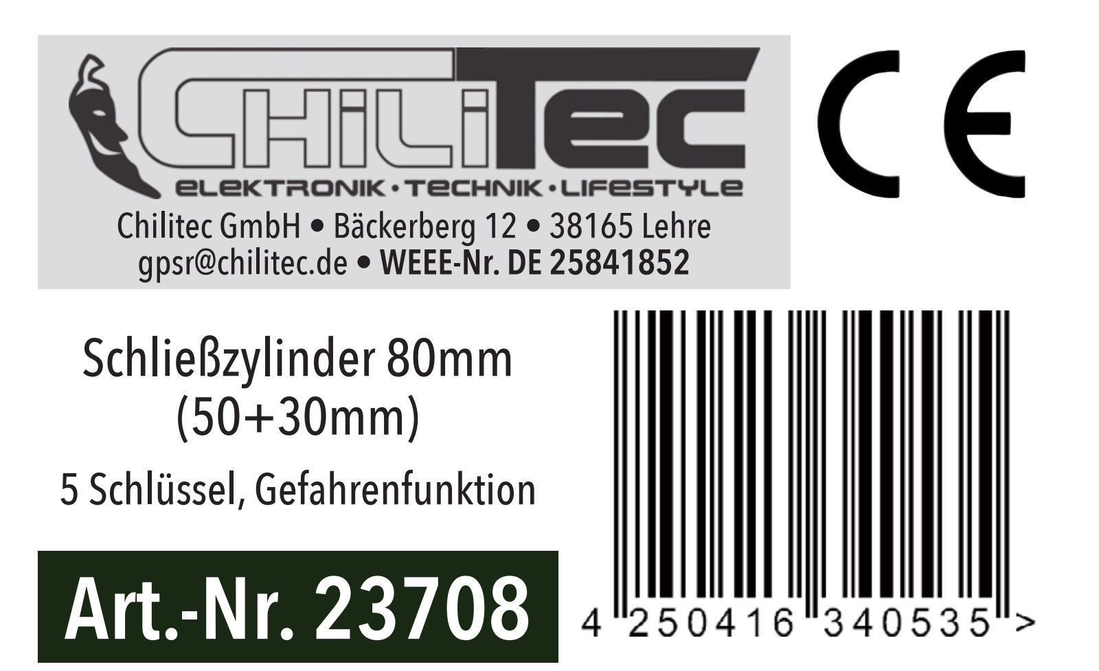 ChiliTec Schließzylinder 80mm (50 + 30mm) 5 Schlüssel, Not- & Gefahrenfunktion