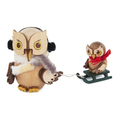 • Räuchermann Eule mit Schlitten und Kind bunt Höhe ca. 16cm NEU Rauchen Rauchfi