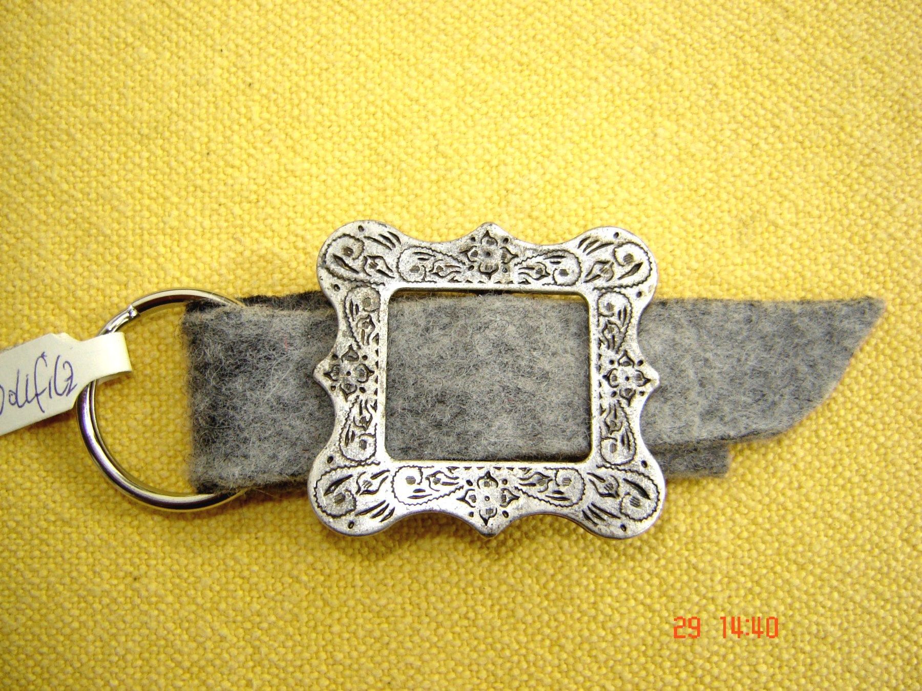Schlüsselanhänger zur Tracht barocke Schließe altsilberfb mit Filz grau stabiler Ring