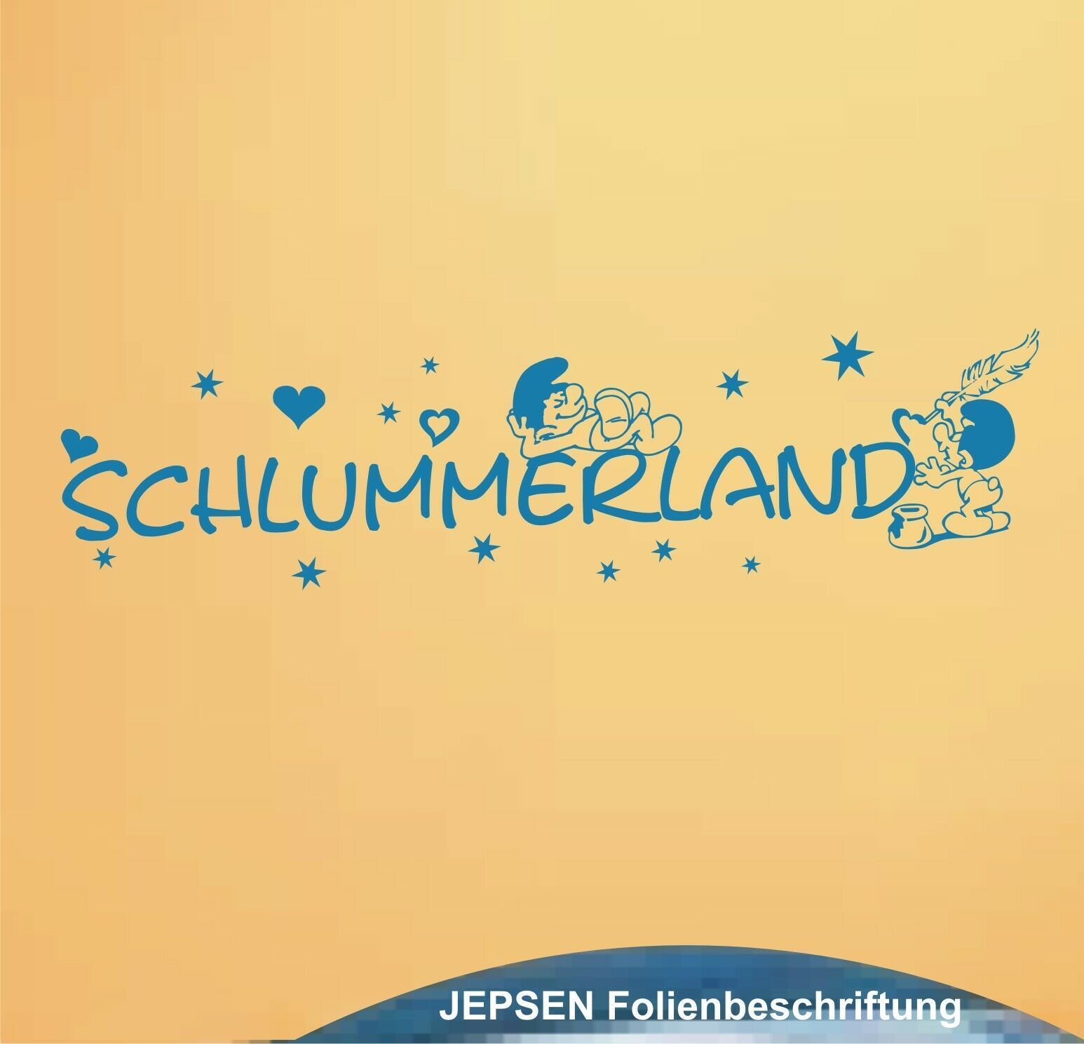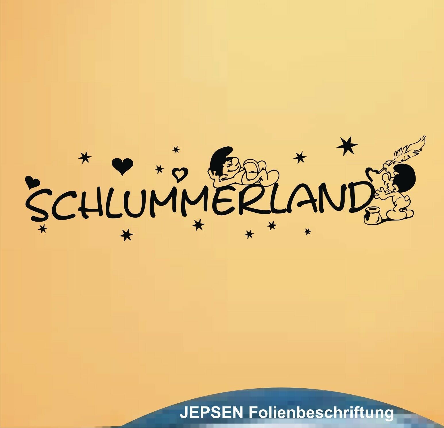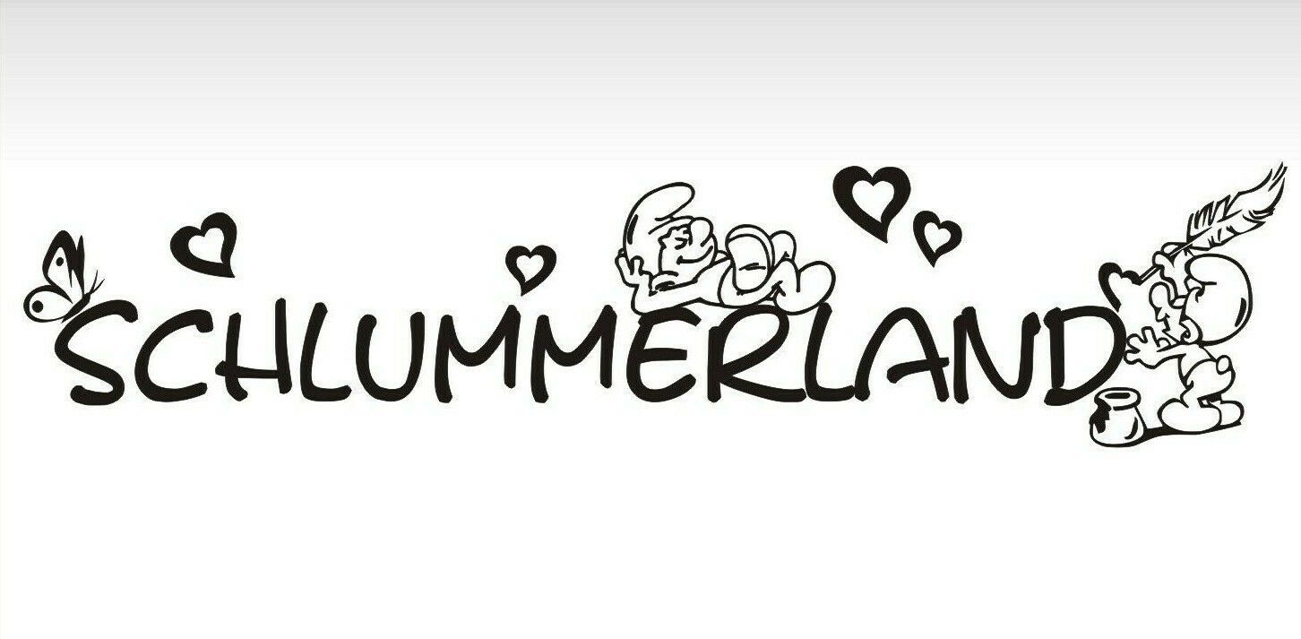 Schlummerland Wandtattoo auch zum verschenken. Größe: 60x15cm inkl. Herzchen und Schlümpfe Ohne Hintergrundfolie, sieht aus wie aufgemalt. Lieferung einteilig auf Übertragungsfolie, einfarbig nach Wunsch inkl Verklebe-Anleitung und Gratis Aufkleber. TIPP: Glanz Folie für glatte Oberflächen - matte Folie für Wandtattoos.