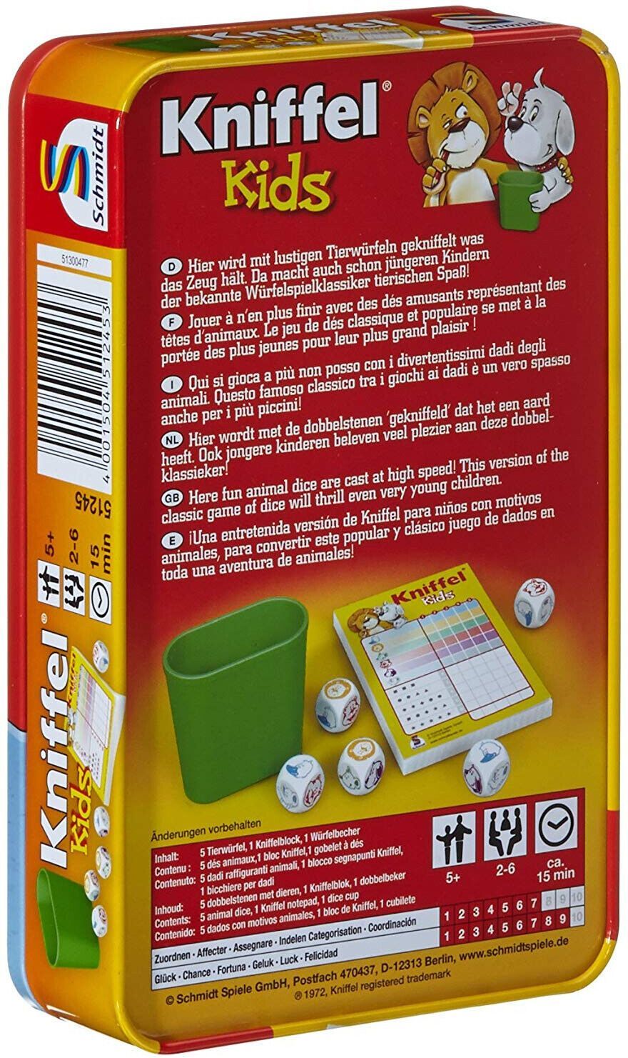 Schmidt Spiele 51245 Kniffel Kids Metalldose Tierwérfel 2-6 Spieler Ab 5 Jahren