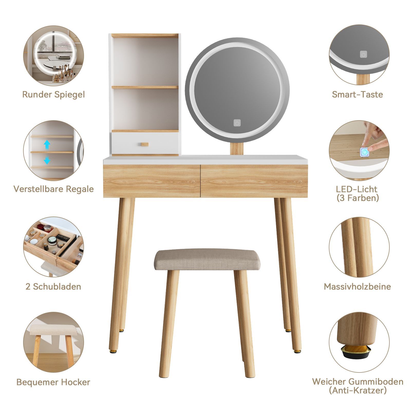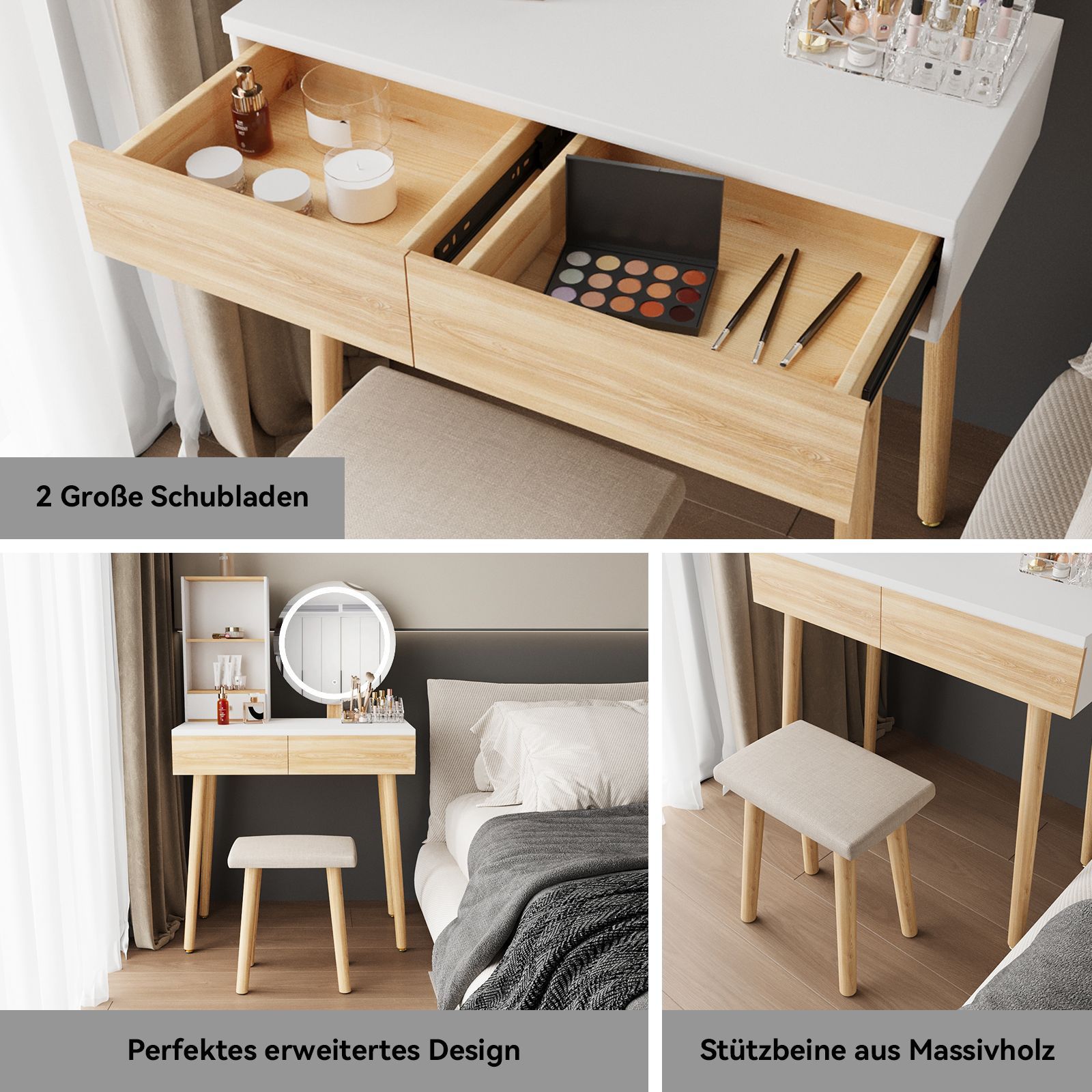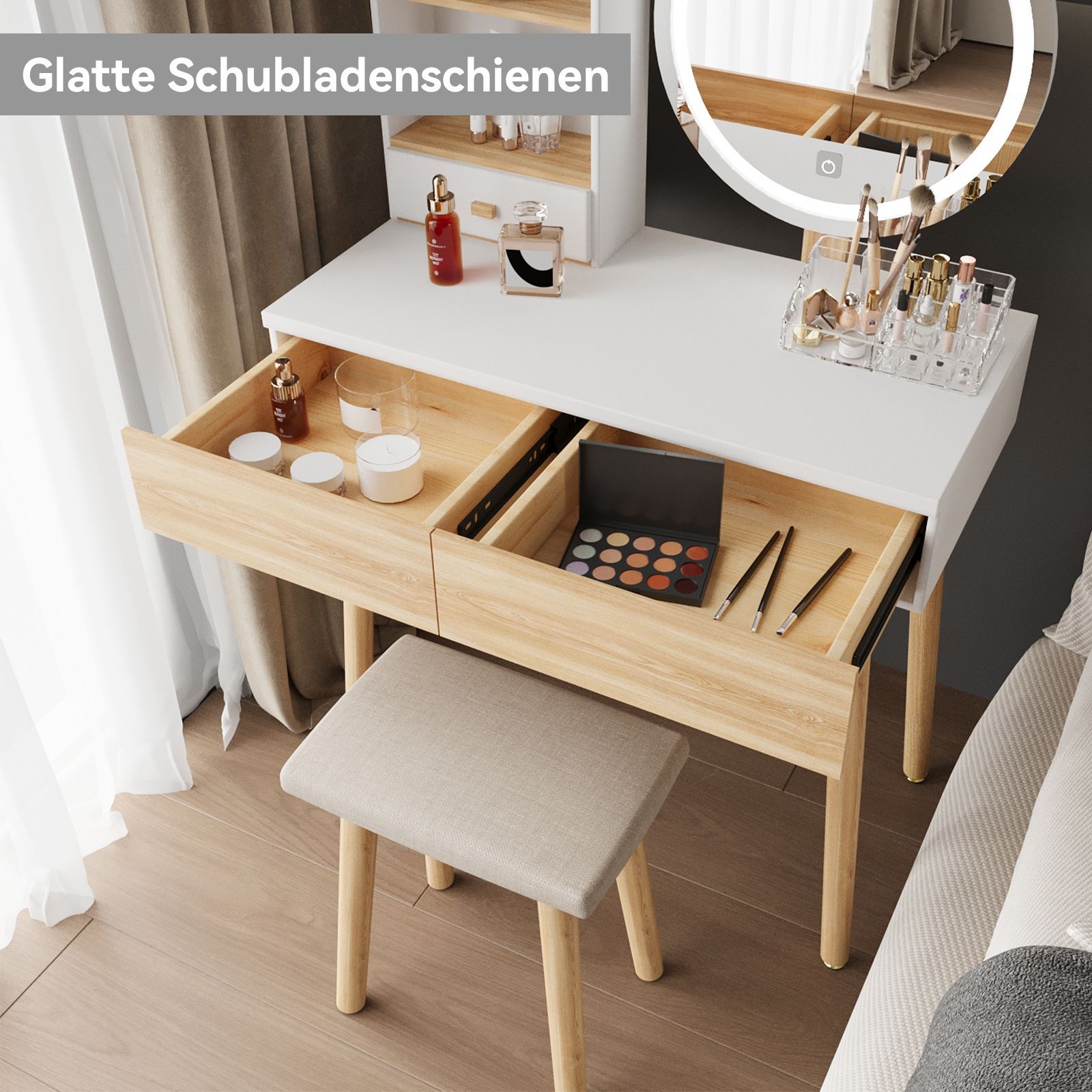 Schminktisch mit LED Spiegel 3 Schubladen Hocker Runder Spiegel