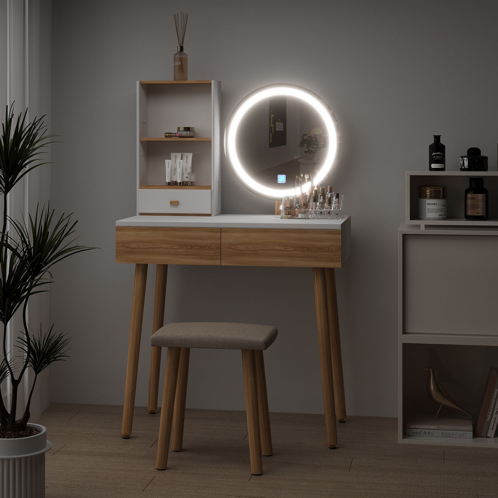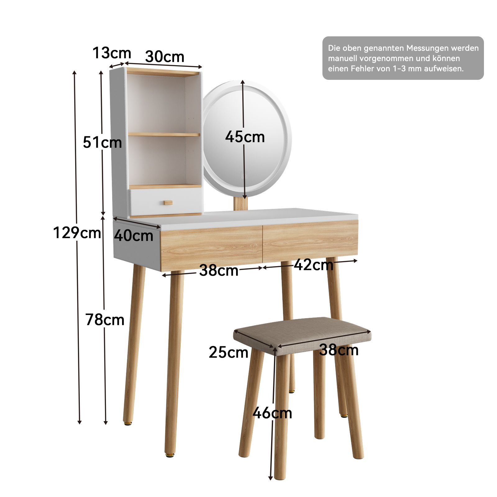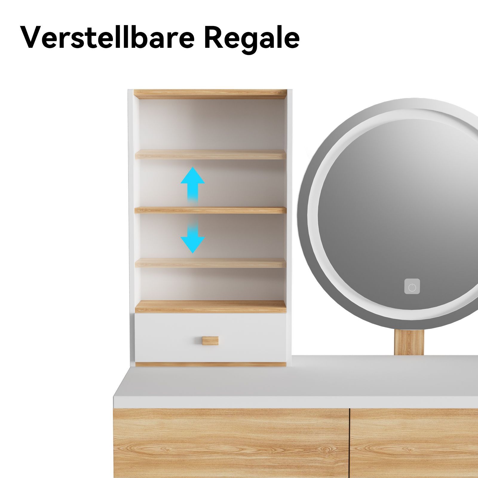 Schminktisch mit LED Spiegel 3 Schubladen Hocker Runder Spiegel