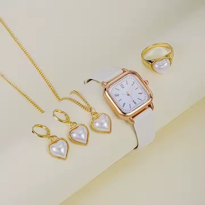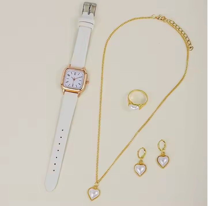 Erleben Sie Eleganz und zeitloses Design mit diesem exquisiten Quarzuhr-Schmuckset, das Ihr Herzstück für jeden Anlass darstellt. Das Set beinhaltet eine charmante Perlenkette, passende Ohrringe und ein elegantes Armband, die sorgfältig verarbeitet sind und Ihren Look mit einem Hauch von Luxus abrun