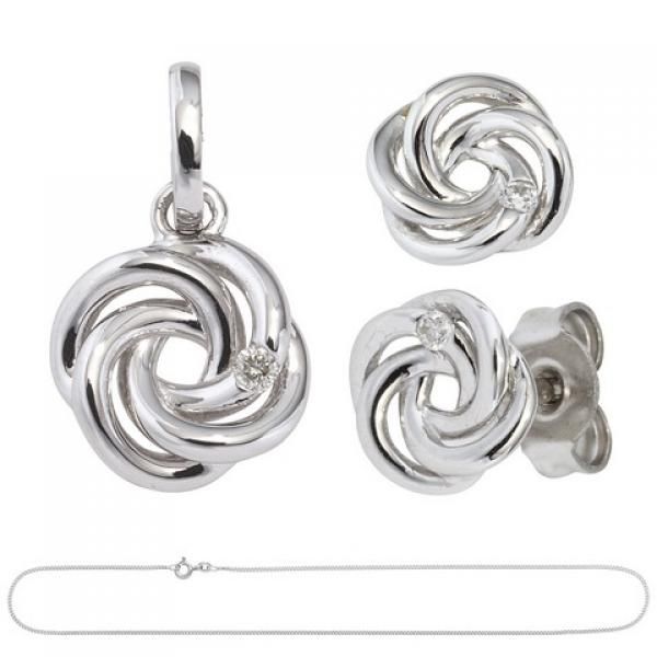 • Schmuck-Set Knoten 585 Gold Weißgold 3 Diamanten Ohrringe und Kette 45 cm