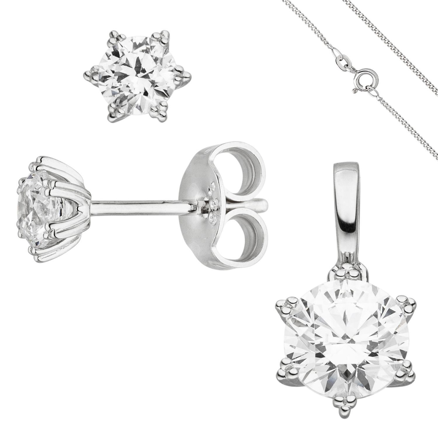 Schmuck-Set, bestehend aus: Anhänger ohne Kette aus 8 Karat (333) Weißgold, mit einem Zirkonia, Durchmesser ca. 7,6 mm, Tiefe ca. 4,3 mm, Innenmaße der Öse ca. 3,5 mm x 2,3 mm, Gewicht ca. 0,5 g * 1 Paar Ohrstecker aus 8 Karat (333) Weißgold, mit 2 Zirkon