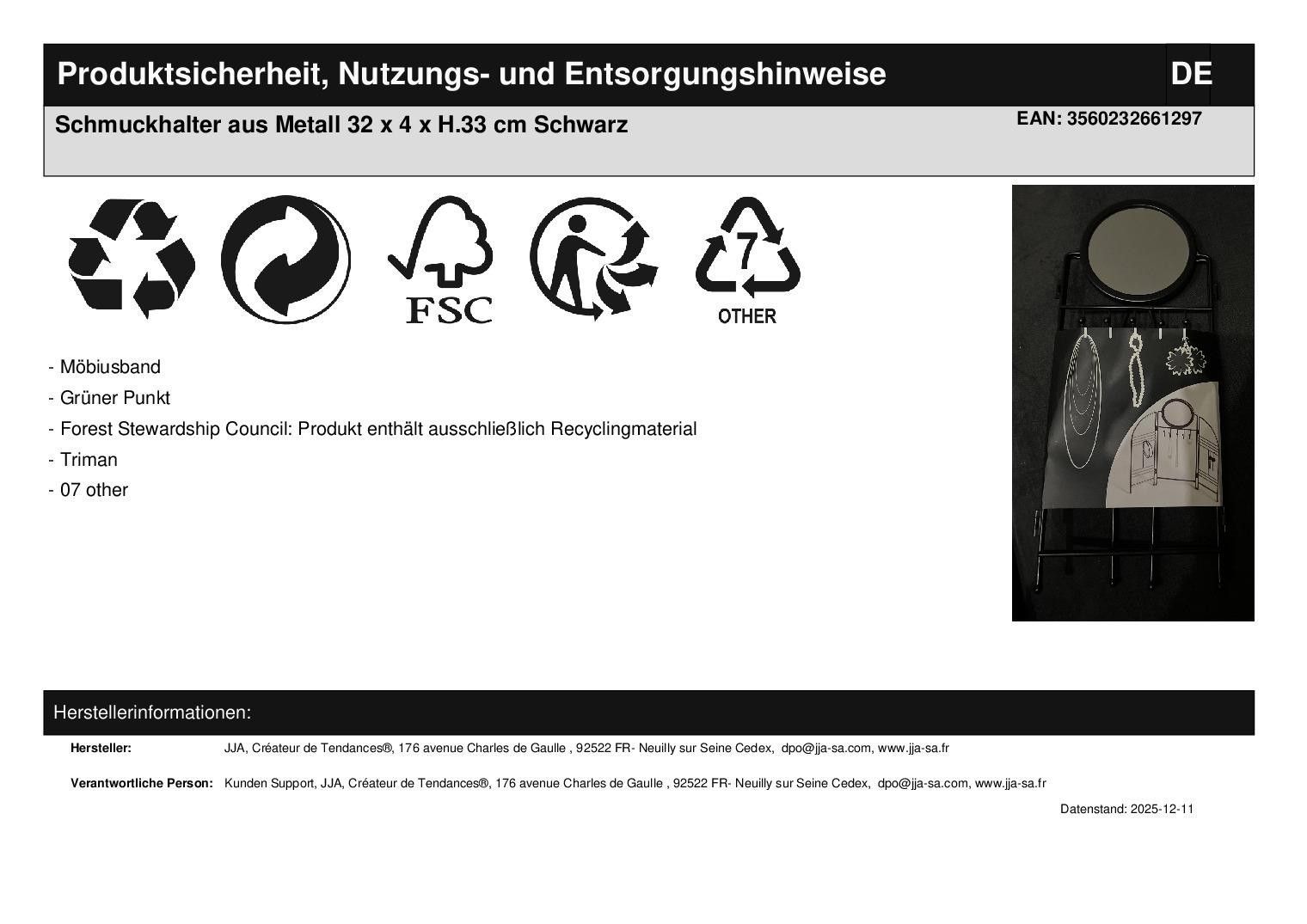 Schmuckhalter aus Metall 32 x 4 x H.33 cm Schwarz