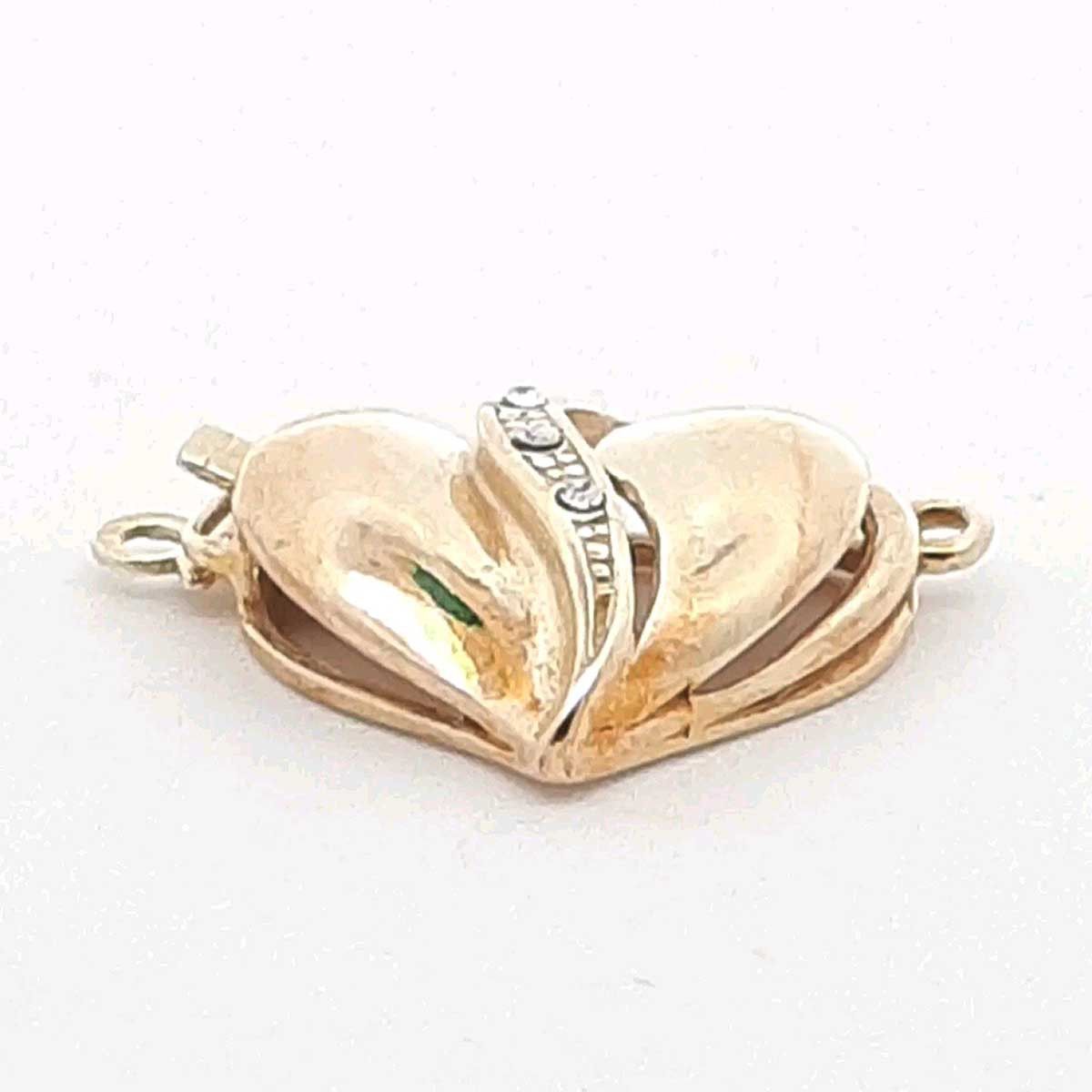Schmuckschließe 9914 Schmuckverschluss Herz Silber vergoldet Ausführung: 1-reihig Form: Herz mit Steinen (Glas-Steinen), Modell 9914 Marke: Augusta Länge: ca. 15,4 mm Breite: ca. 12,5 Höhe: ca. 5,4 mm Schmuckschließen-Typ: Collierschließen