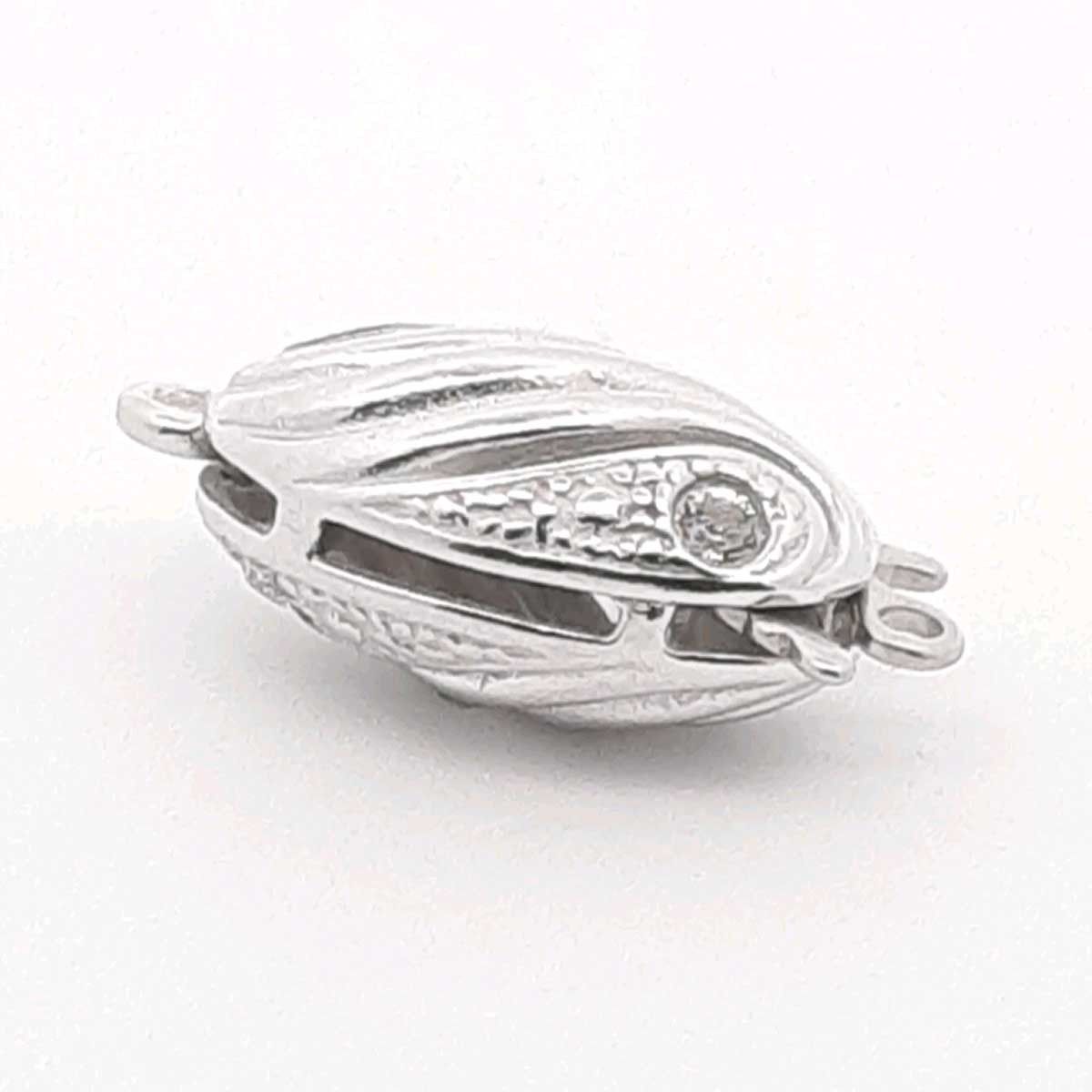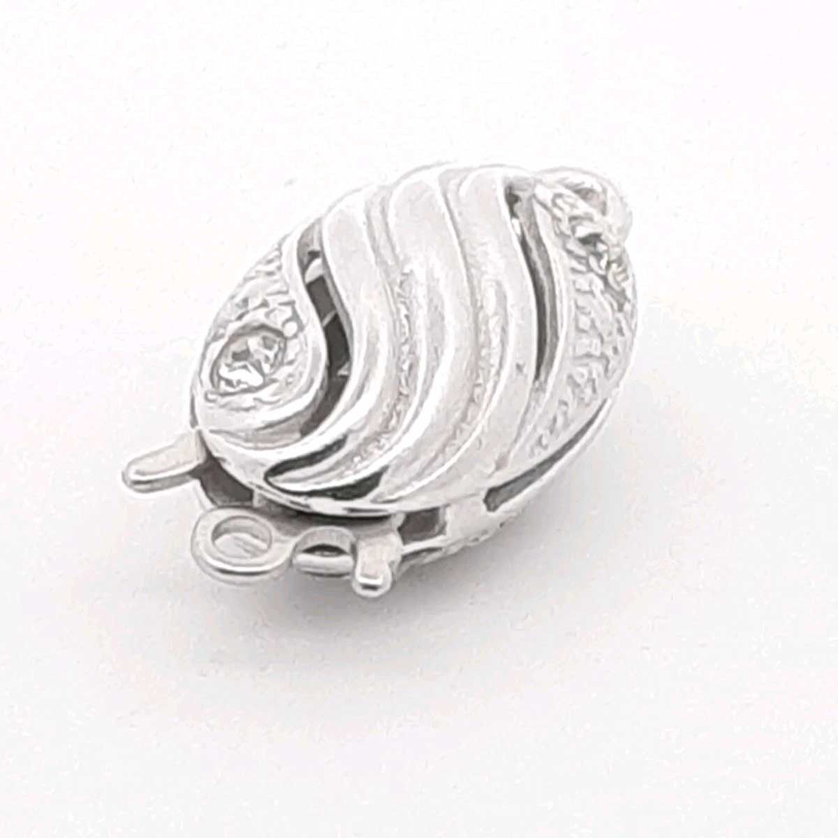 Schmuckschließe 9920 Silber Schmuckverschluss Collierschließe Oval Material: Silber rhodiniert Ausführung: 1-reihig Form: Oval mit Glas-Steinen, Modell 9920 Marke: Augusta Länge: ca. 14,4 mm Höhe: ca. 7,2 mm Breite: ca. 8,7 mm