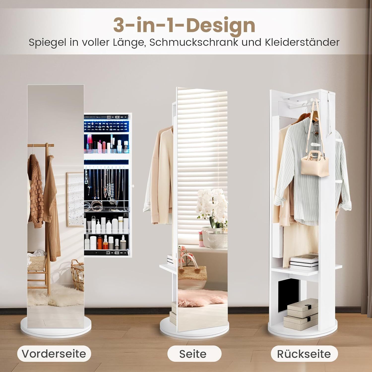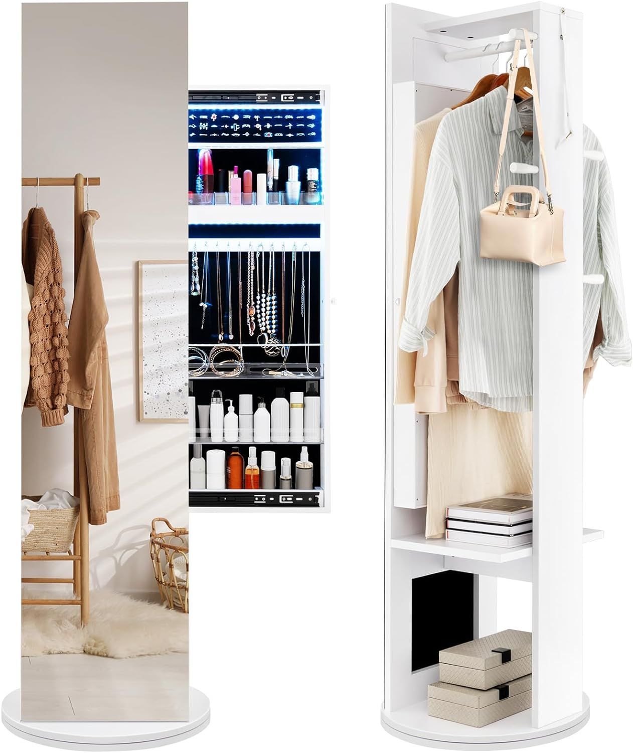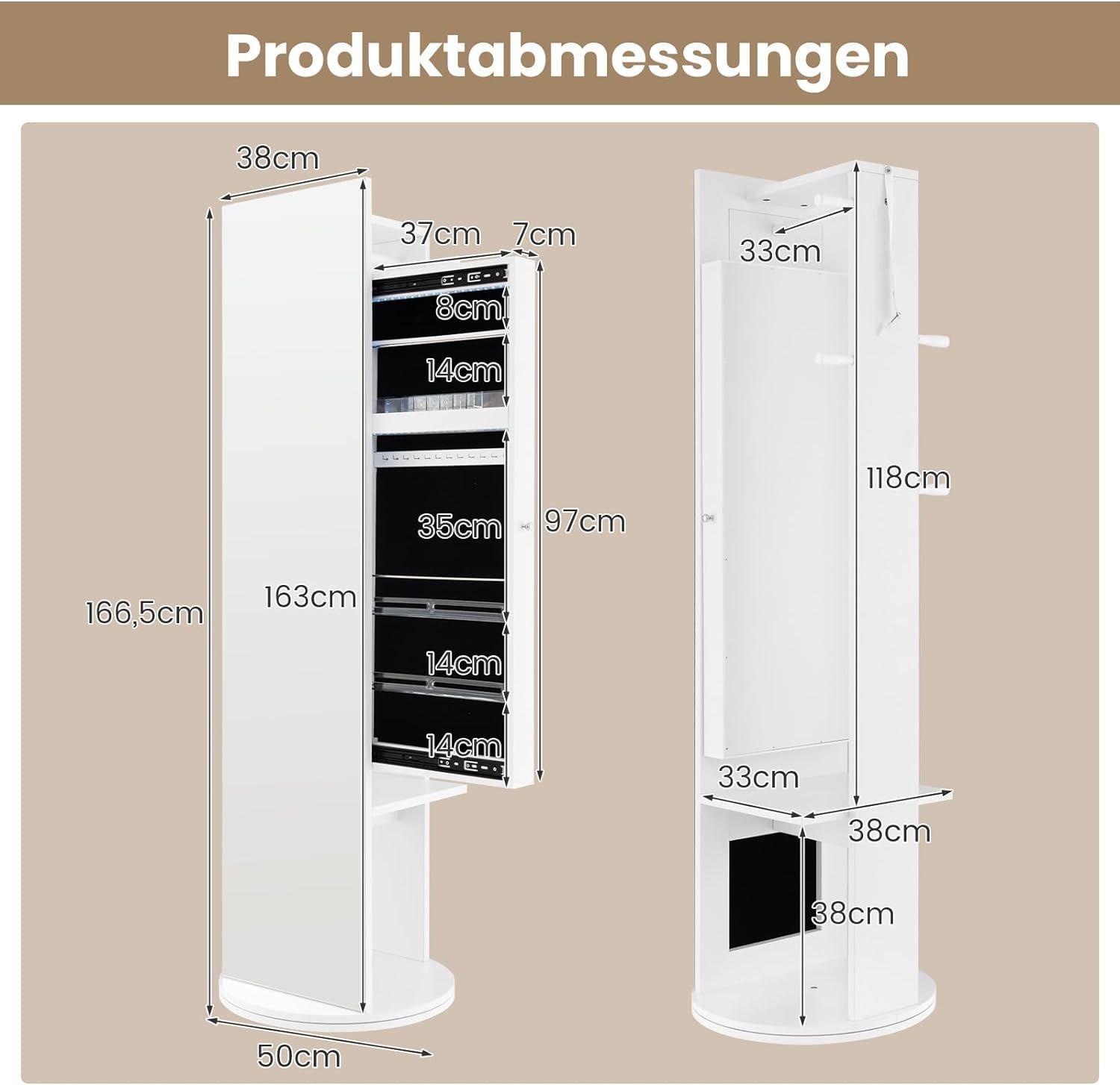 Schmuckschrank mit Spiegel, freistehender Spiegelschrank 360°drehbar mit LED-Leuchten