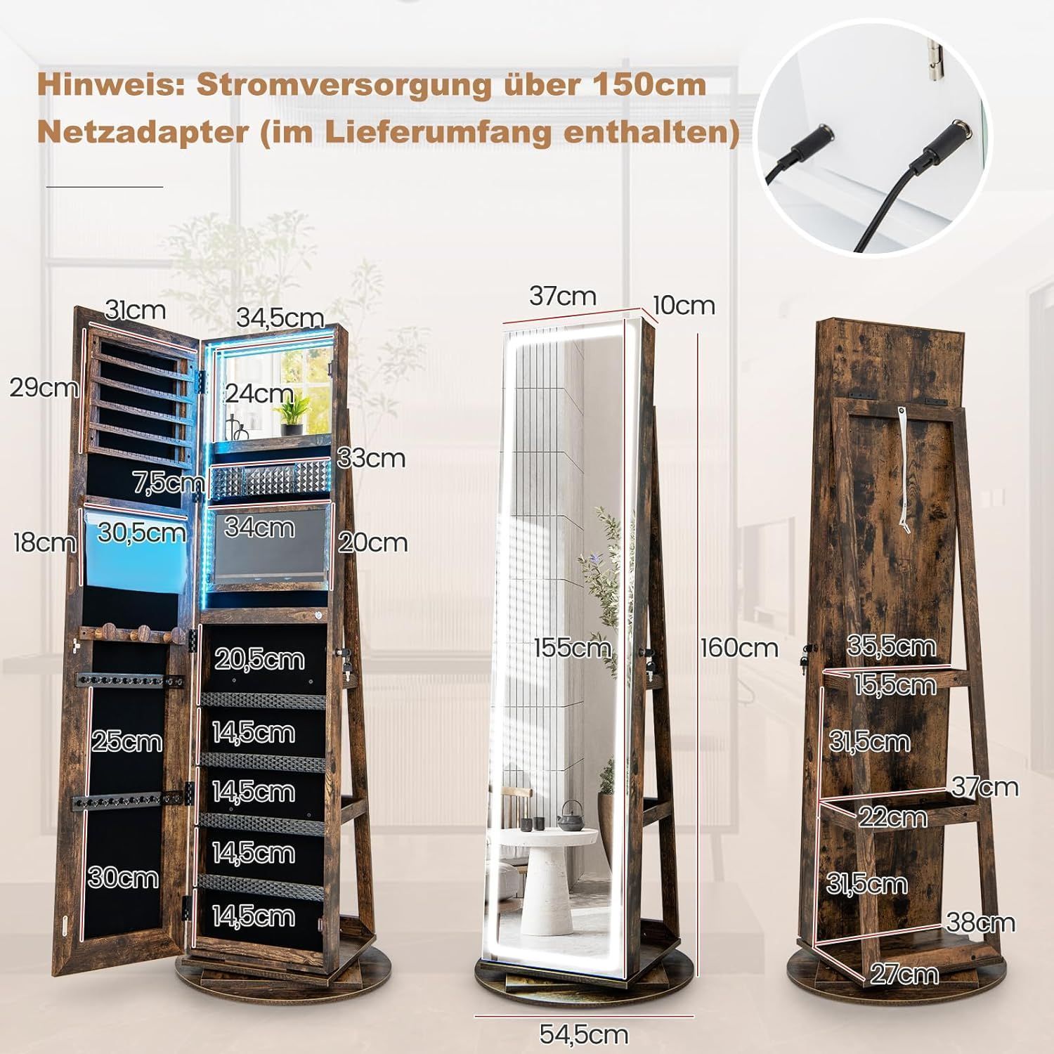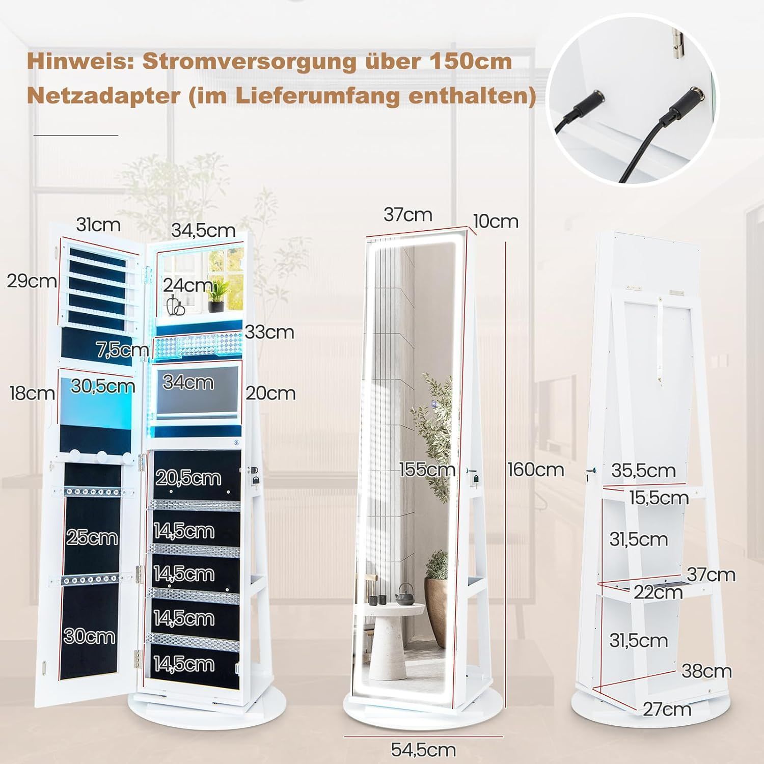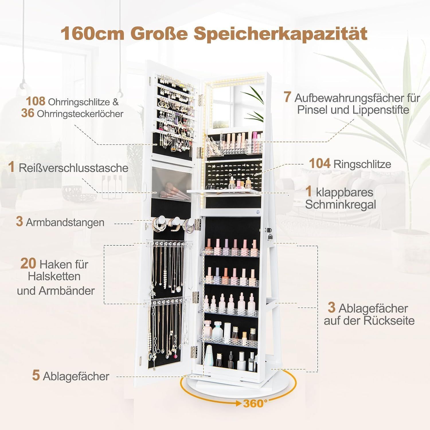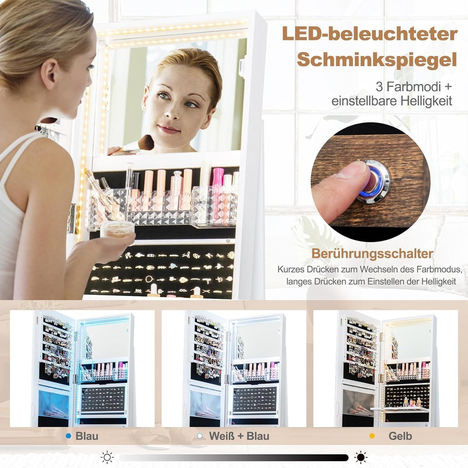 Schmuckschrank mit Spiegel, Schmuck Spiegelschrank mit verstellbaren LED-Leuchten