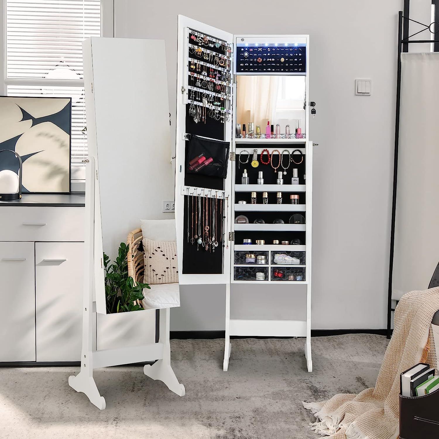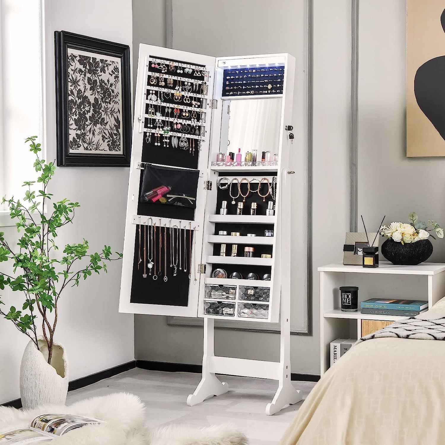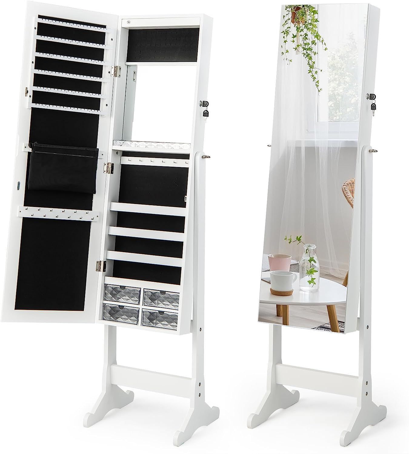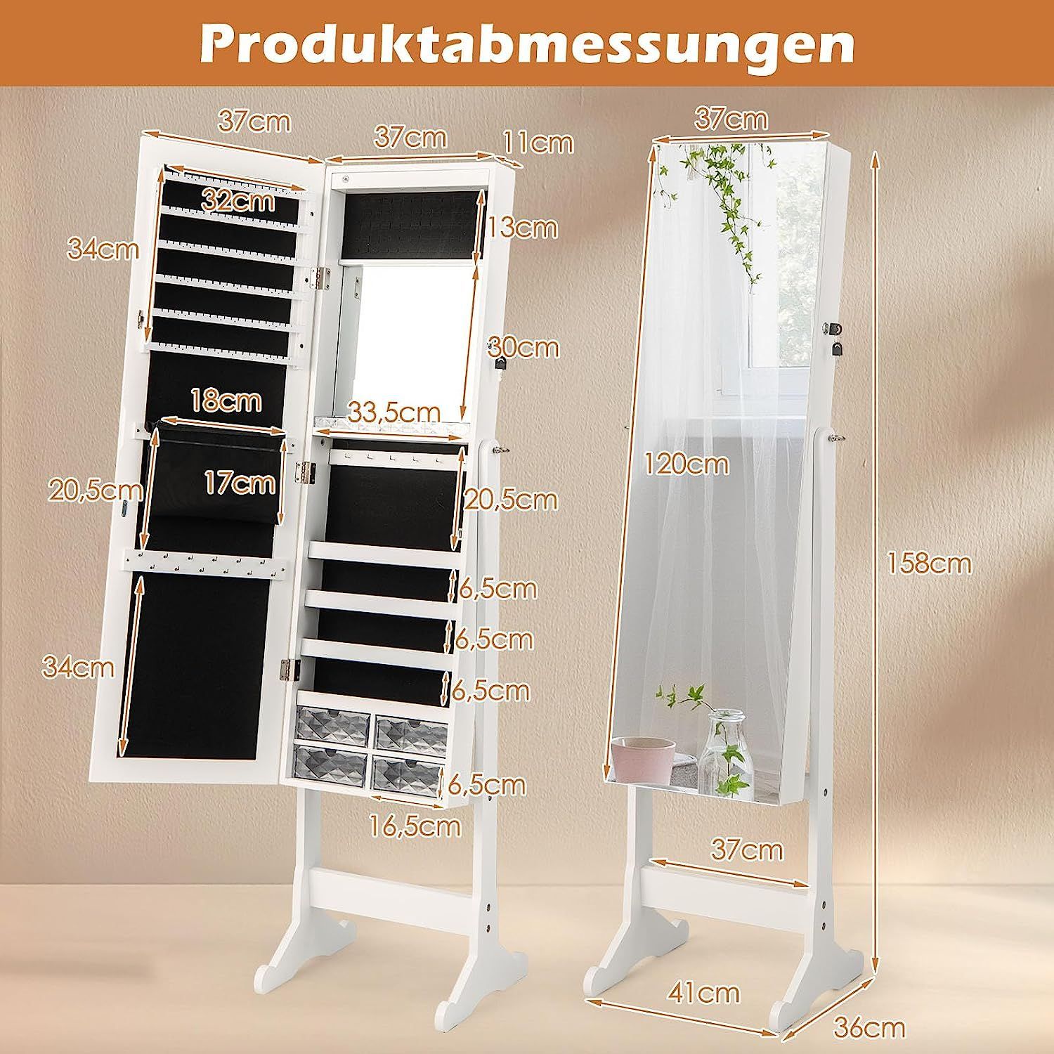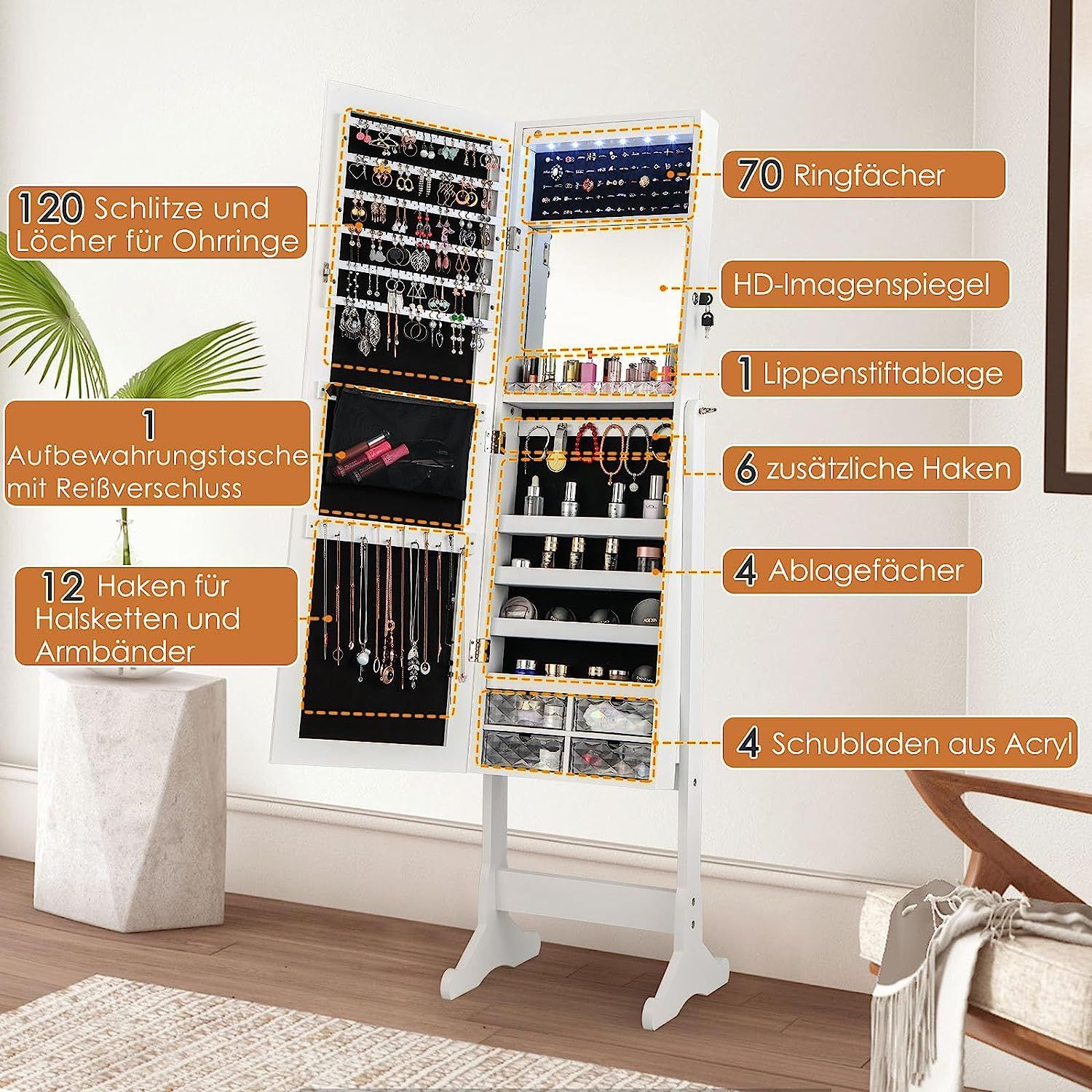 Schmuckschrank neigungsverstellbar, freistehender Schmuckregal mit Ganzkörperspiegel