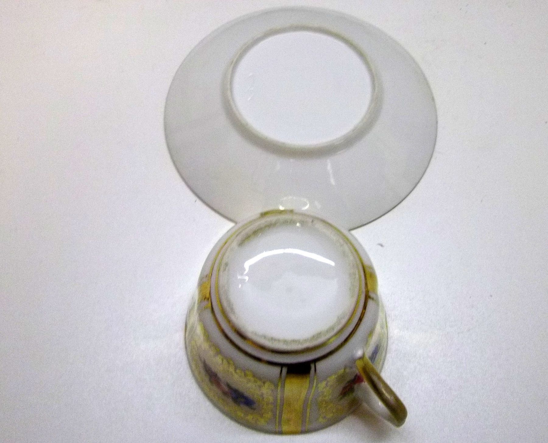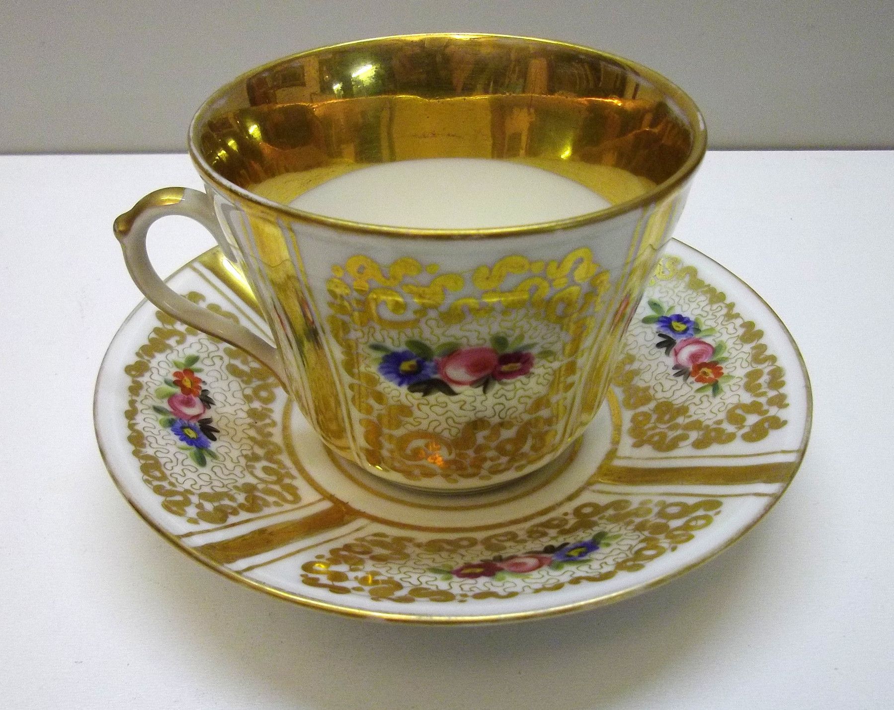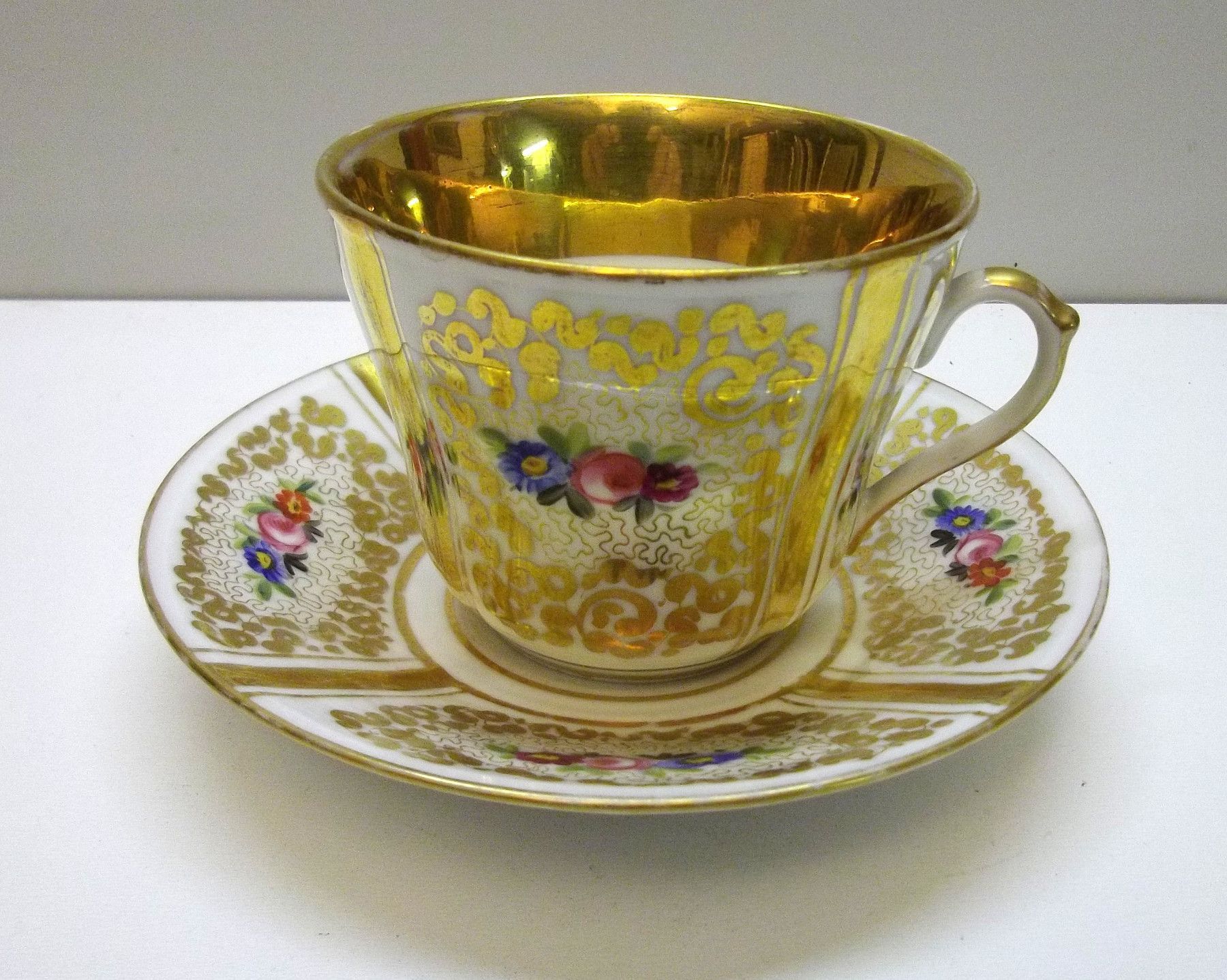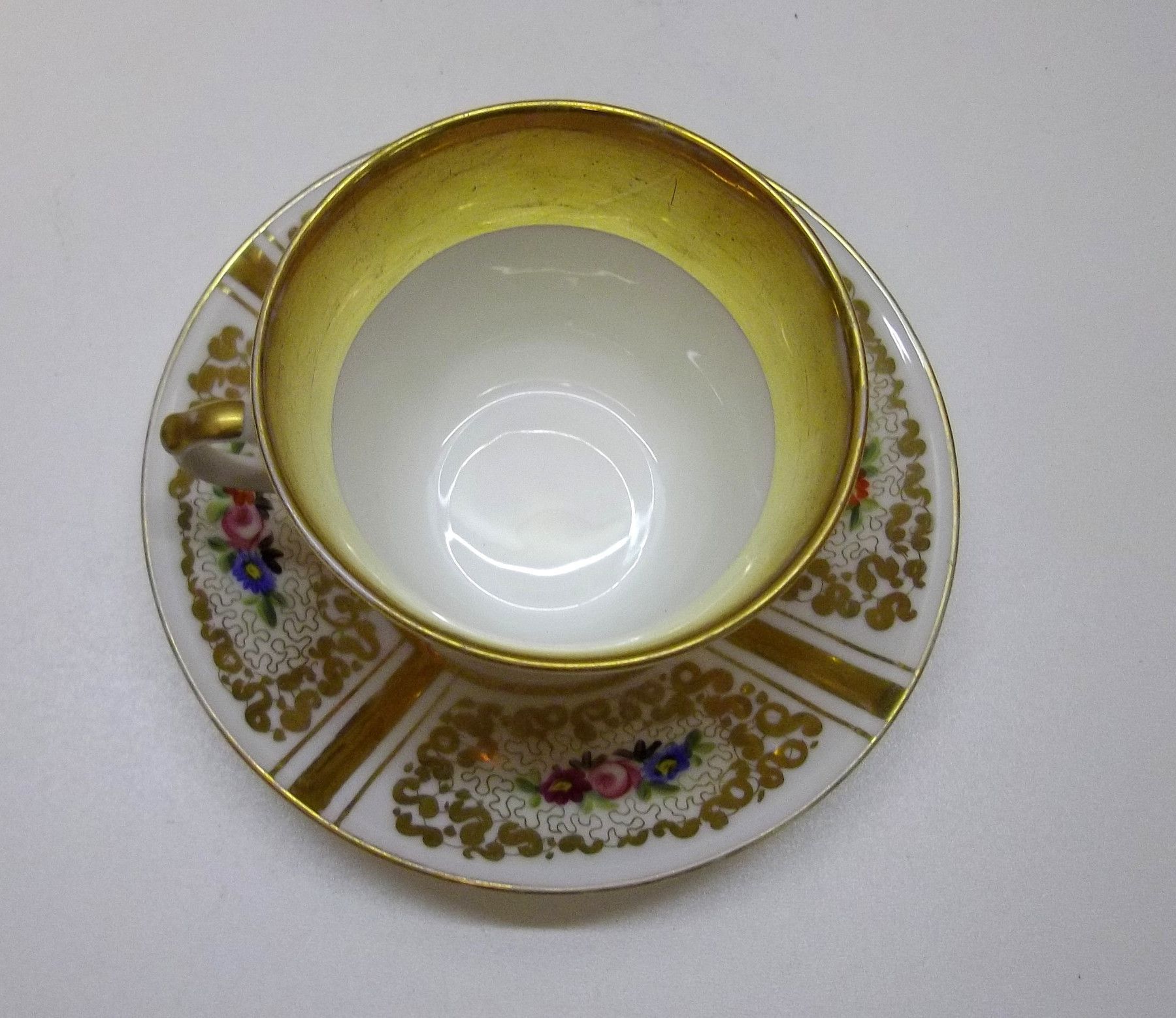 Große Schmuck-Tasse um 1880 (Gründerjahre). Ohne Marke. Sehr gute Handmalerei. Das Gold ist etwas abgenutzt. Maße: Tassenhöhe 8,5, Tellerdurchmesser 17 cm. Antikes am Deich - Inh: Oliver Kipp-Trense