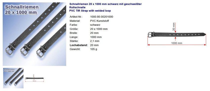 Schnallriemen 15 x 200 mm schwarz mit geschweißter Rollschnalle PVC TIR Strap with welded loop Artikel-Nr.: 1000.80.00150200 Material: PVC Kunststoff Farbe: schwarz Größe: 15 x 200 mm Breite: 15 mm Länge: 200 mm Stärke: 2,1 mm Lochabstand: 20 mm Gewicht: 20 g Schnallriemen 20 x 200 mm schwarz mit ge